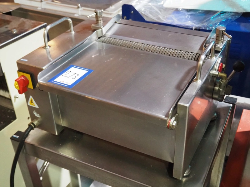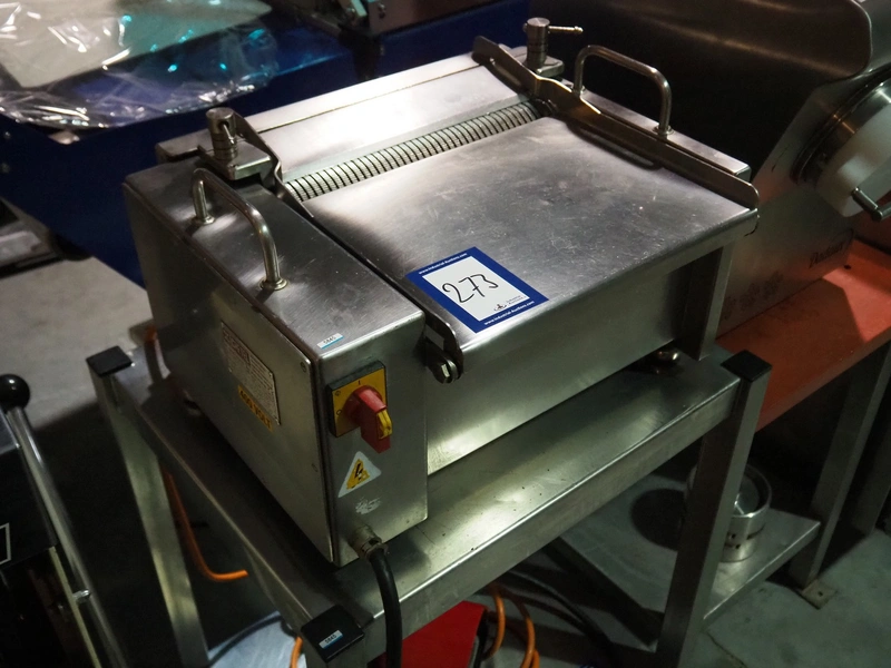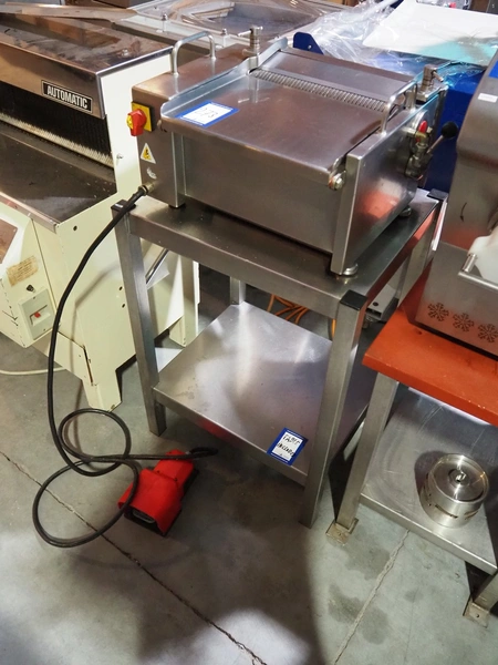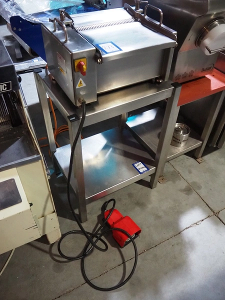 Cretel skinning machine on s/s trolley with foot control, type: 361 F, number: 732.98.05, year of construction: 1998, 220/380 V, 3 Ph, 50 Hz, 1.85/1.05 A, 0.37 kW, working width: 315 mm, total dimensions: 600 mm x 500 mm x 1150 mm.