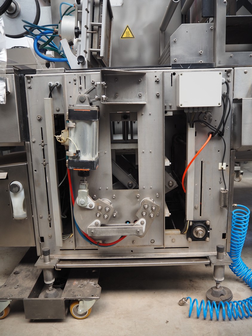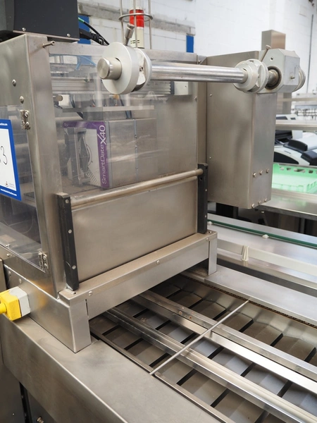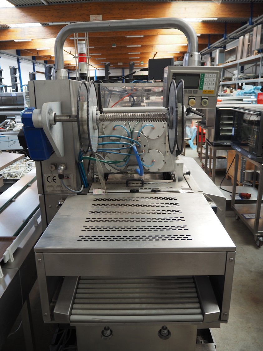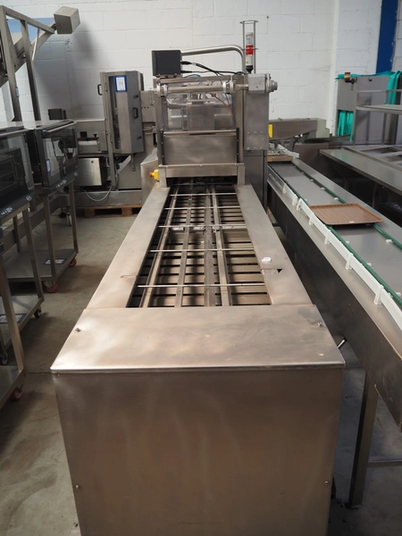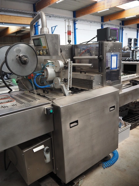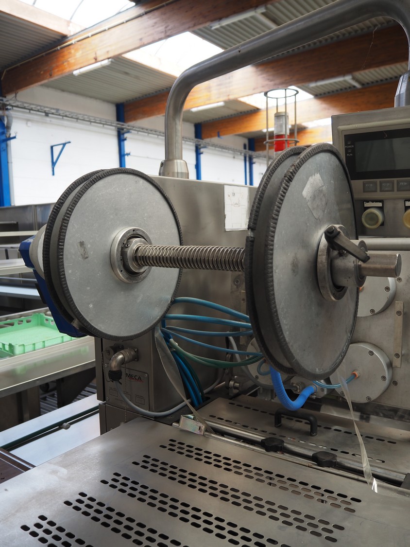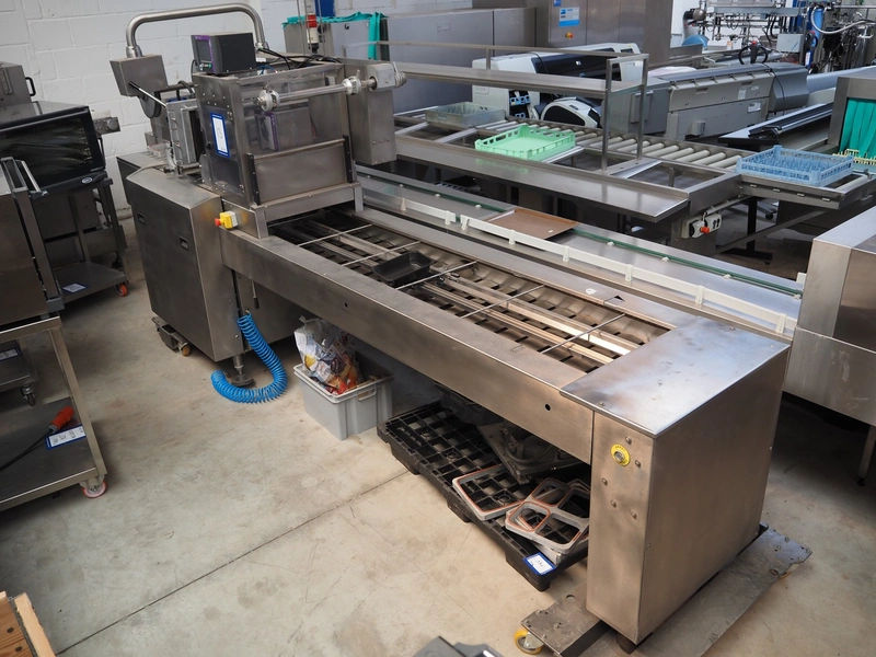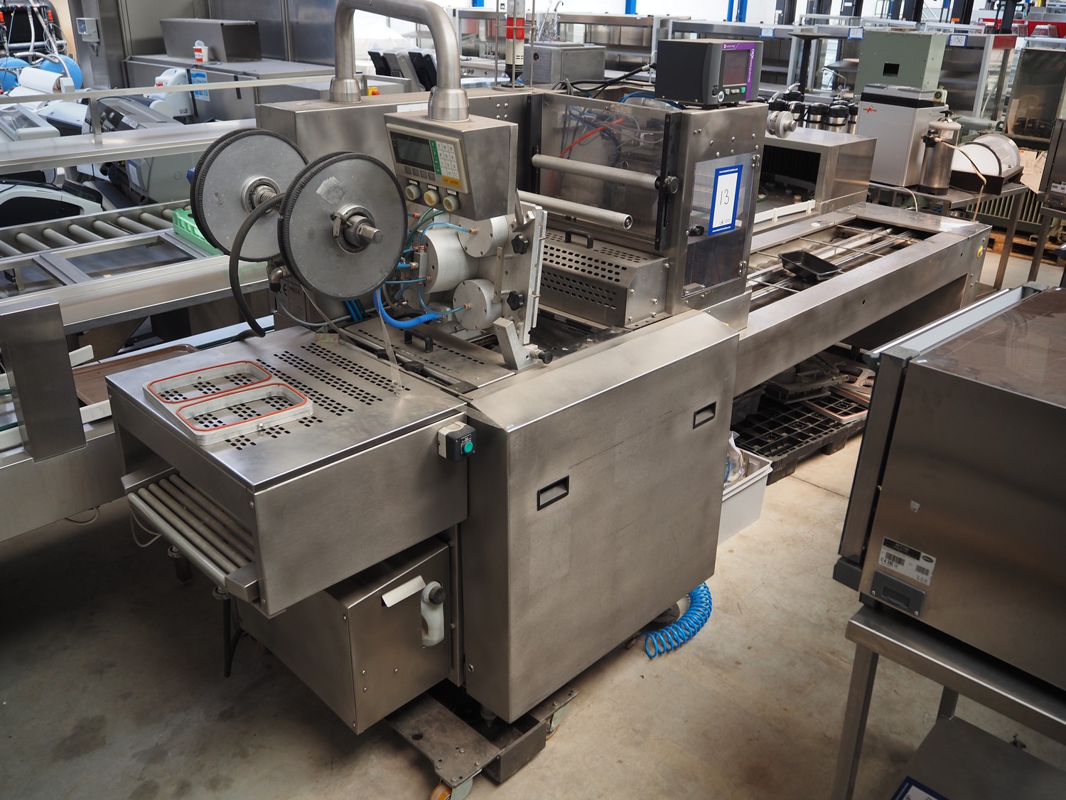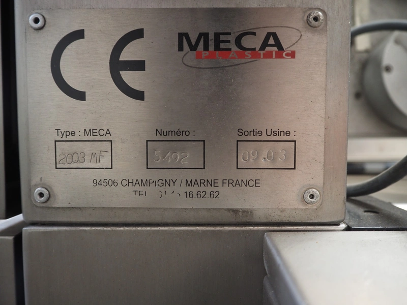 Meca Plastic traysealer, type: MECA 2003 MF, number: 5492, year of construction: 09.03, chain infeed conveyor with dividers, chain width: 450 mm, distance between dividers: 390 mm, outfeed roller conveyor, plastic rollers, roller width: 970 mm, total dimensions: 4100 mm x 1000 mm x 2000 mm. Including pallet with 8 extra dye's, dye dimensions: 300 mm x 250 mm, 320 mm x 260 mm, (2x) 250 mm x 140 mm, (4x) 140 mm x 120 mm. Rollies not included.
