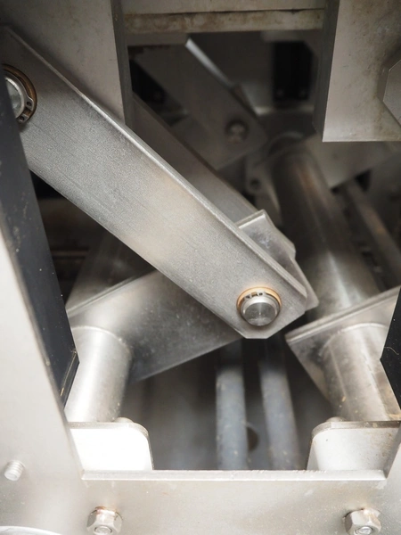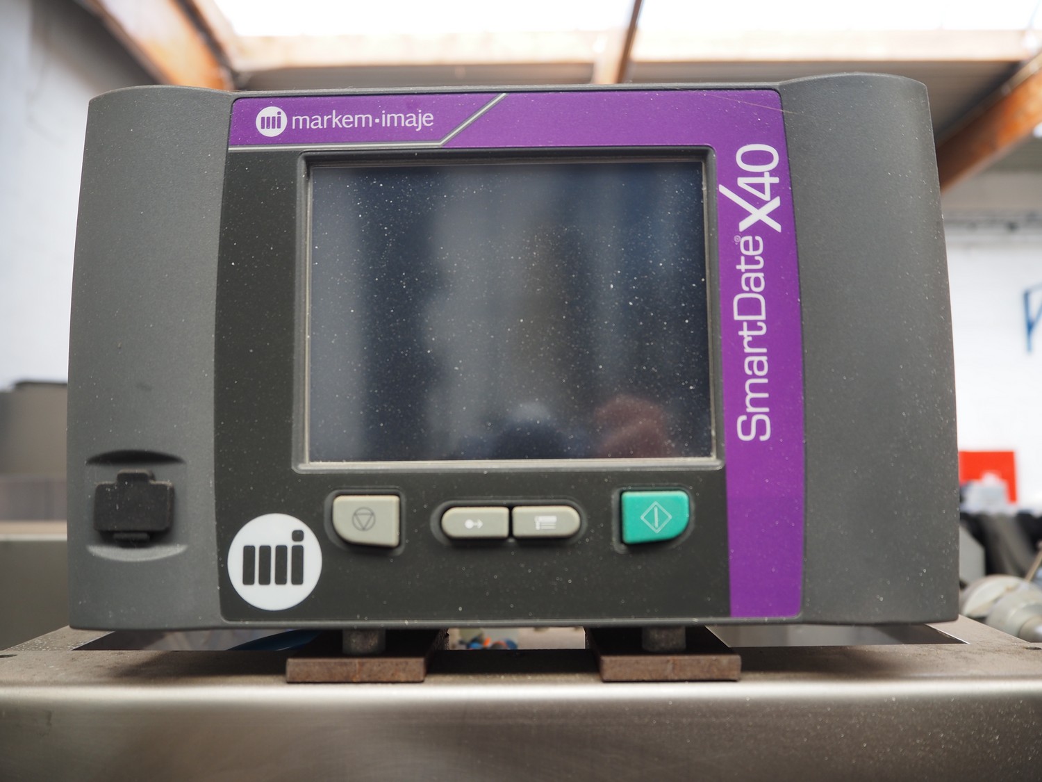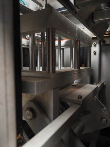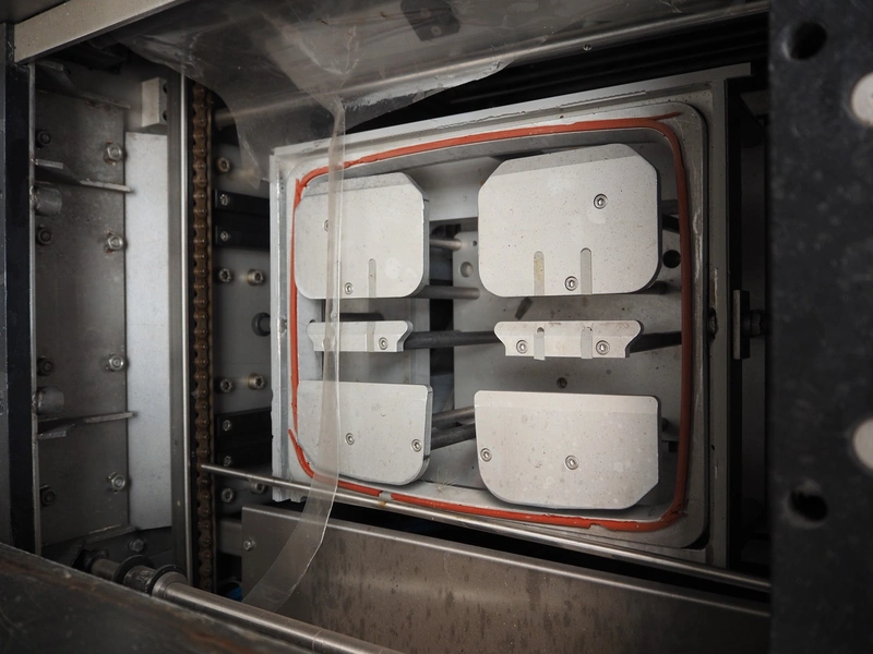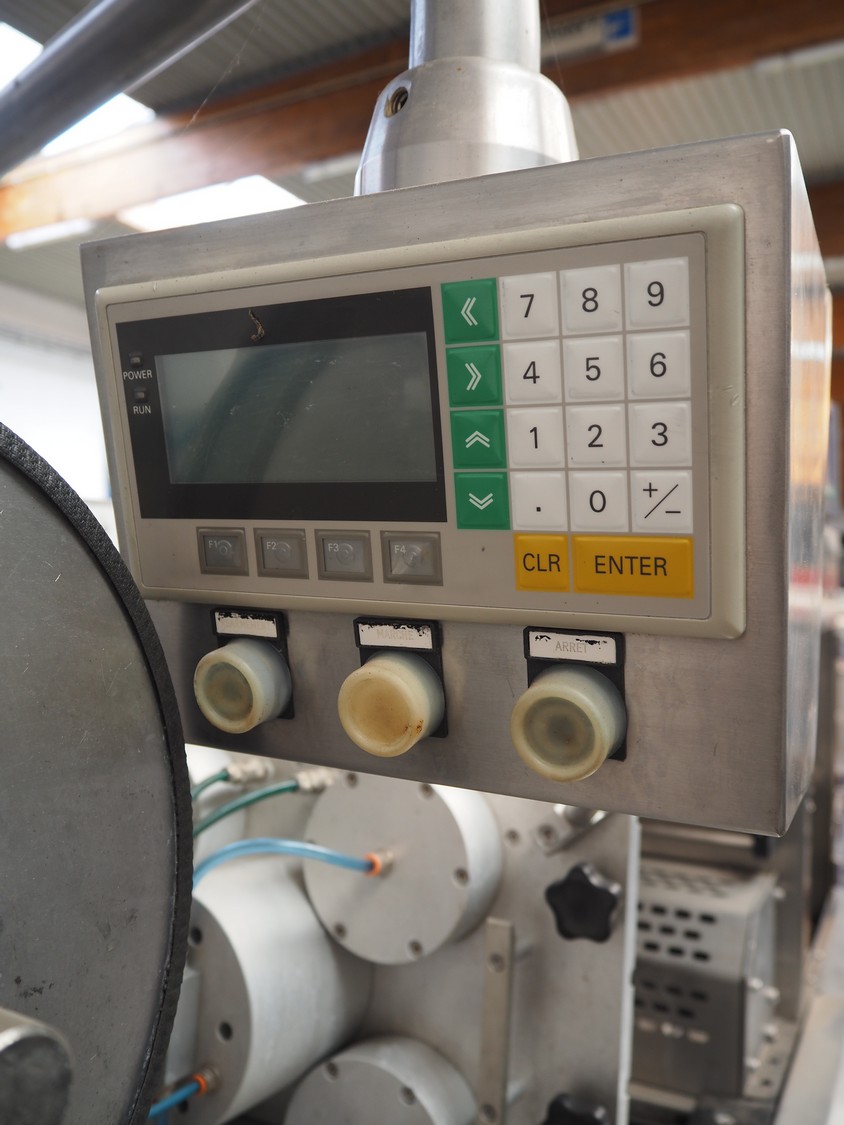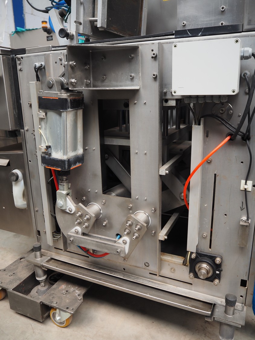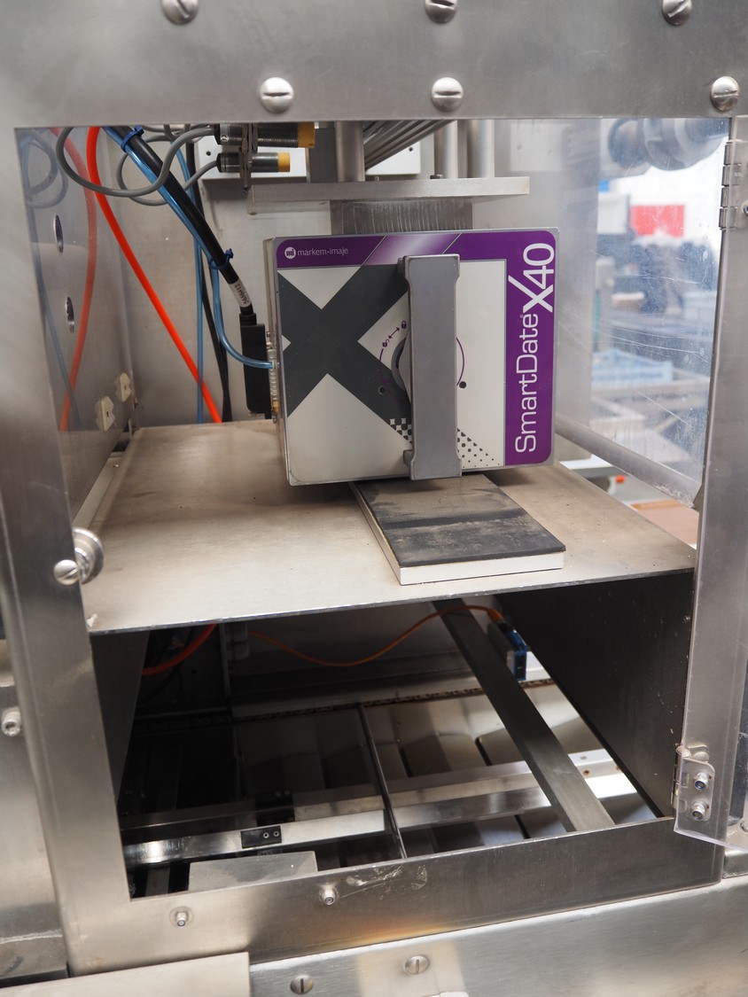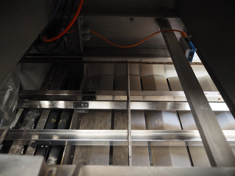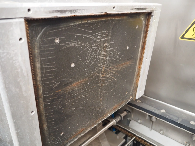 Meca Plastic traysealer, type: MECA 2003 MF, number: 5492, year of construction: 09.03, chain infeed conveyor with dividers, chain width: 450 mm, distance between dividers: 390 mm, outfeed roller conveyor, plastic rollers, roller width: 970 mm, total dimensions: 4100 mm x 1000 mm x 2000 mm. Including pallet with 8 extra dye's, dye dimensions: 300 mm x 250 mm, 320 mm x 260 mm, (2x) 250 mm x 140 mm, (4x) 140 mm x 120 mm. Rollies not included.