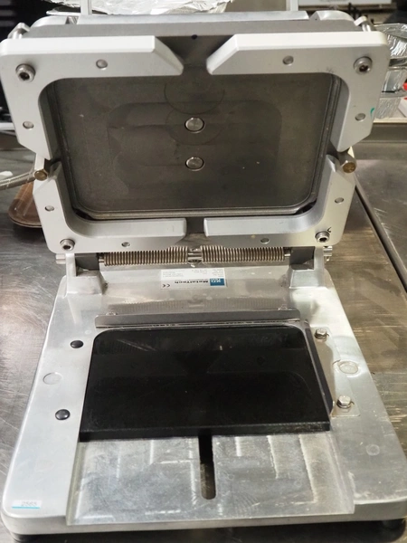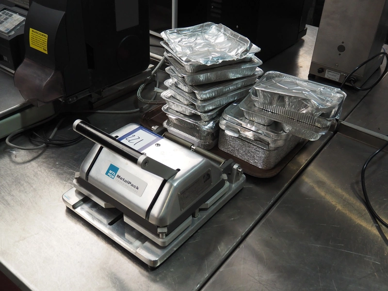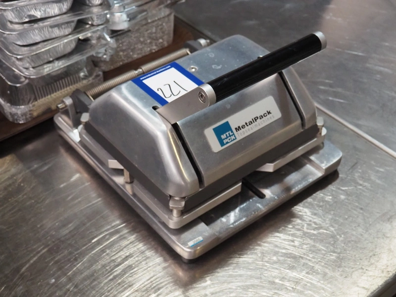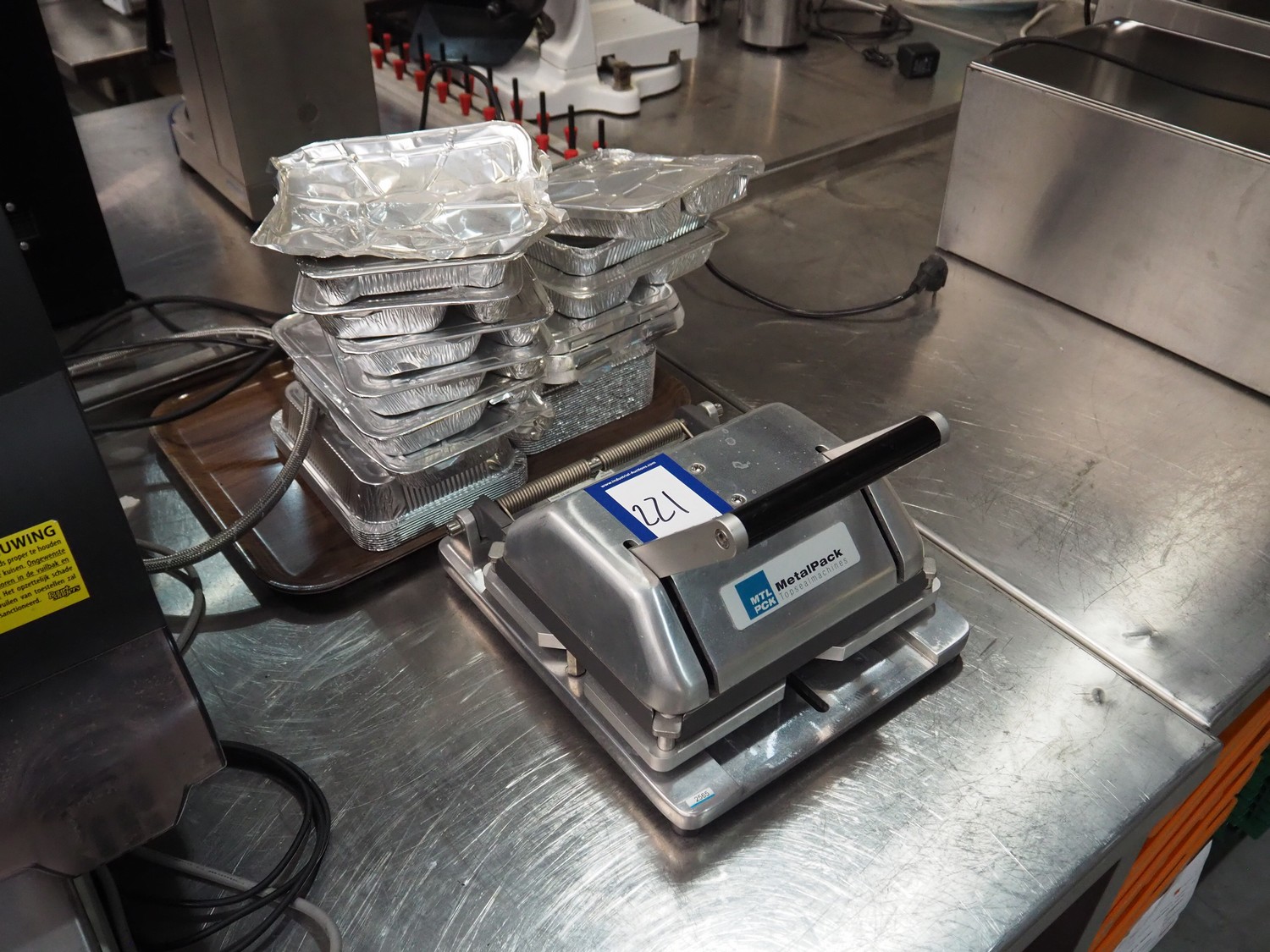 MetalTech lid closer for metal trays, type: 227, serial number: 8207, year of construction: 2016, dye: 230 mm x 175 mm, total dimensions: 300 mm x 350 mm x 390 mm.