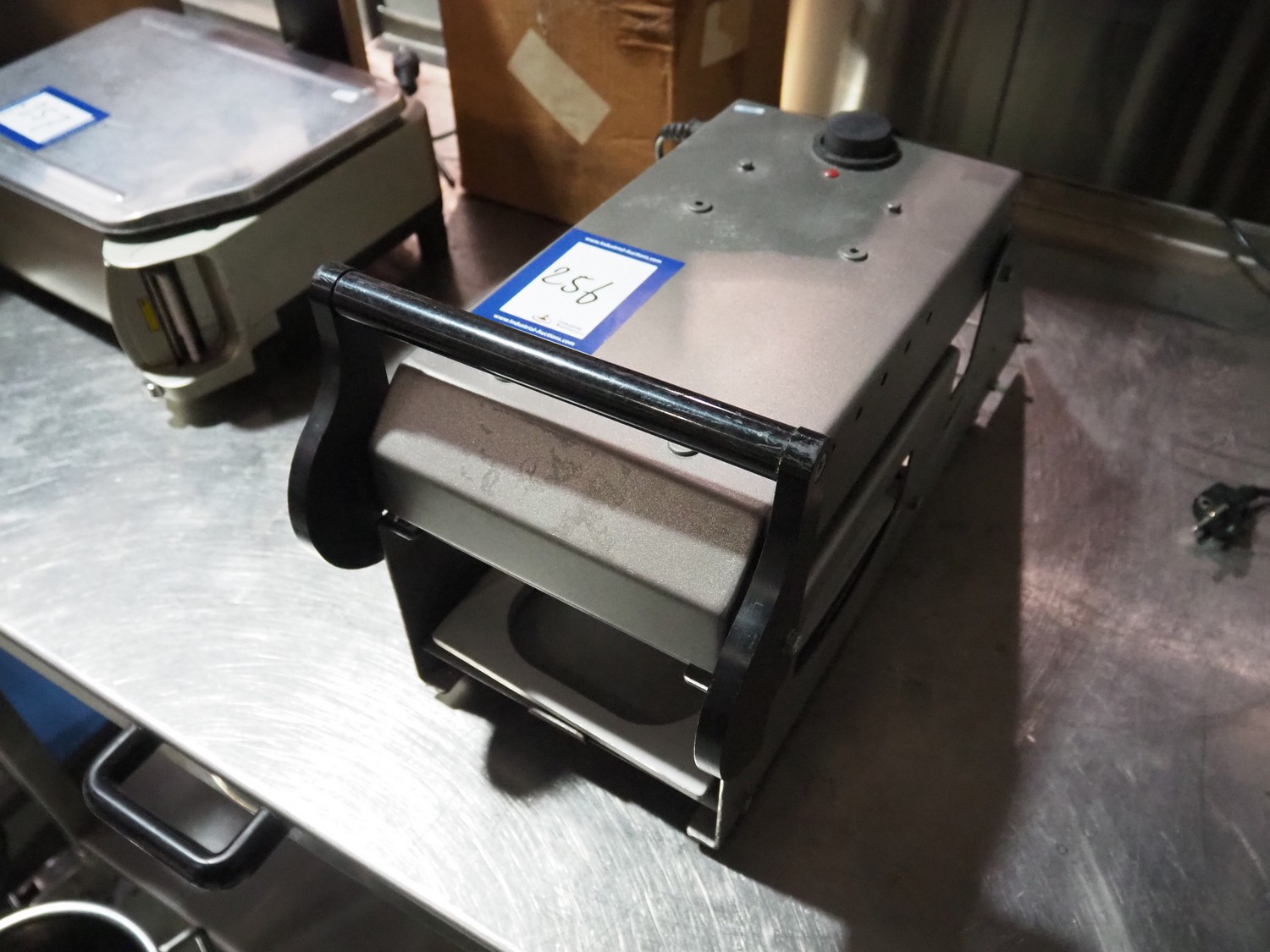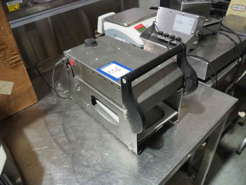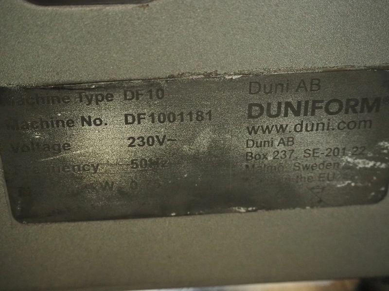 Duniform tray sealer, type: DF10, machine number: DF1001181, 230 V, 50 Hz, 0.5 kW, dye: 145 mm x 245 mm, total dimensions: 260 mm x 550 mm x 340 mm.