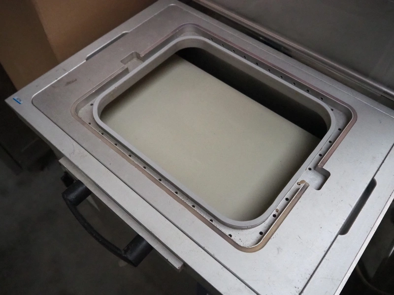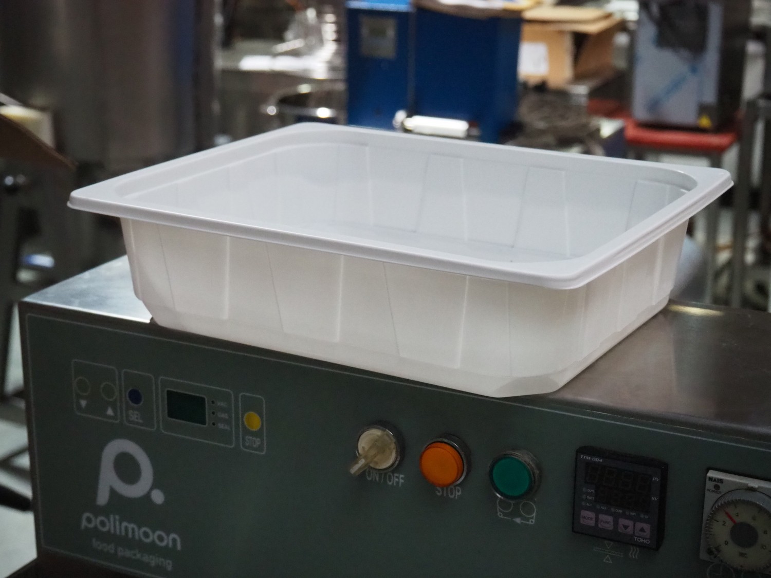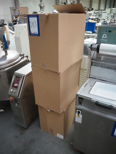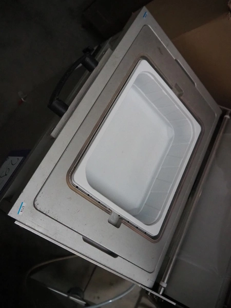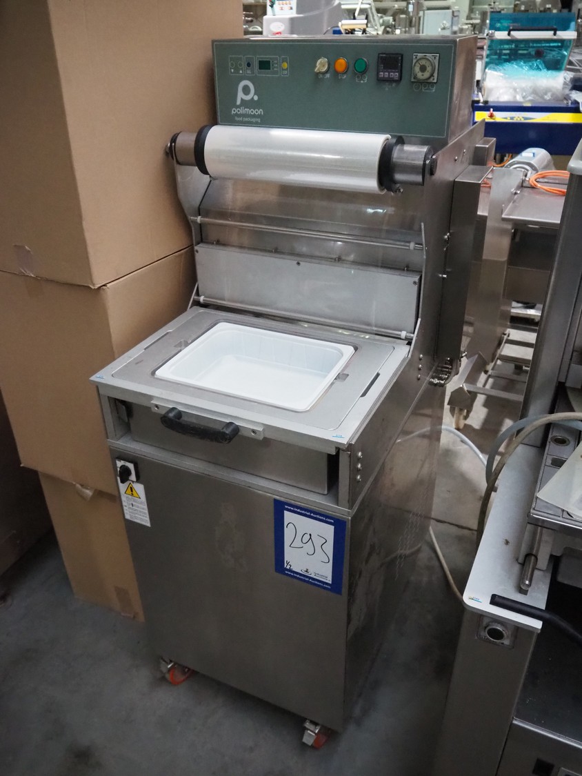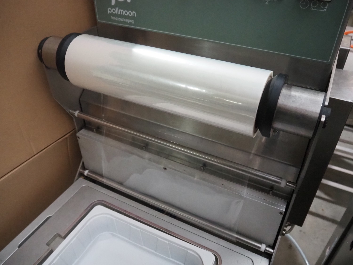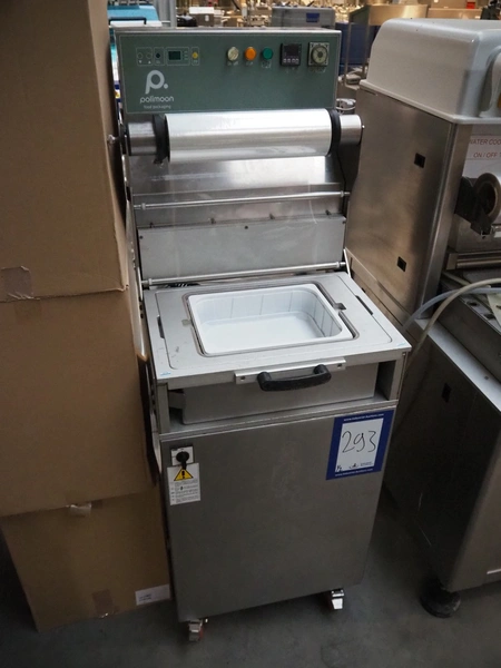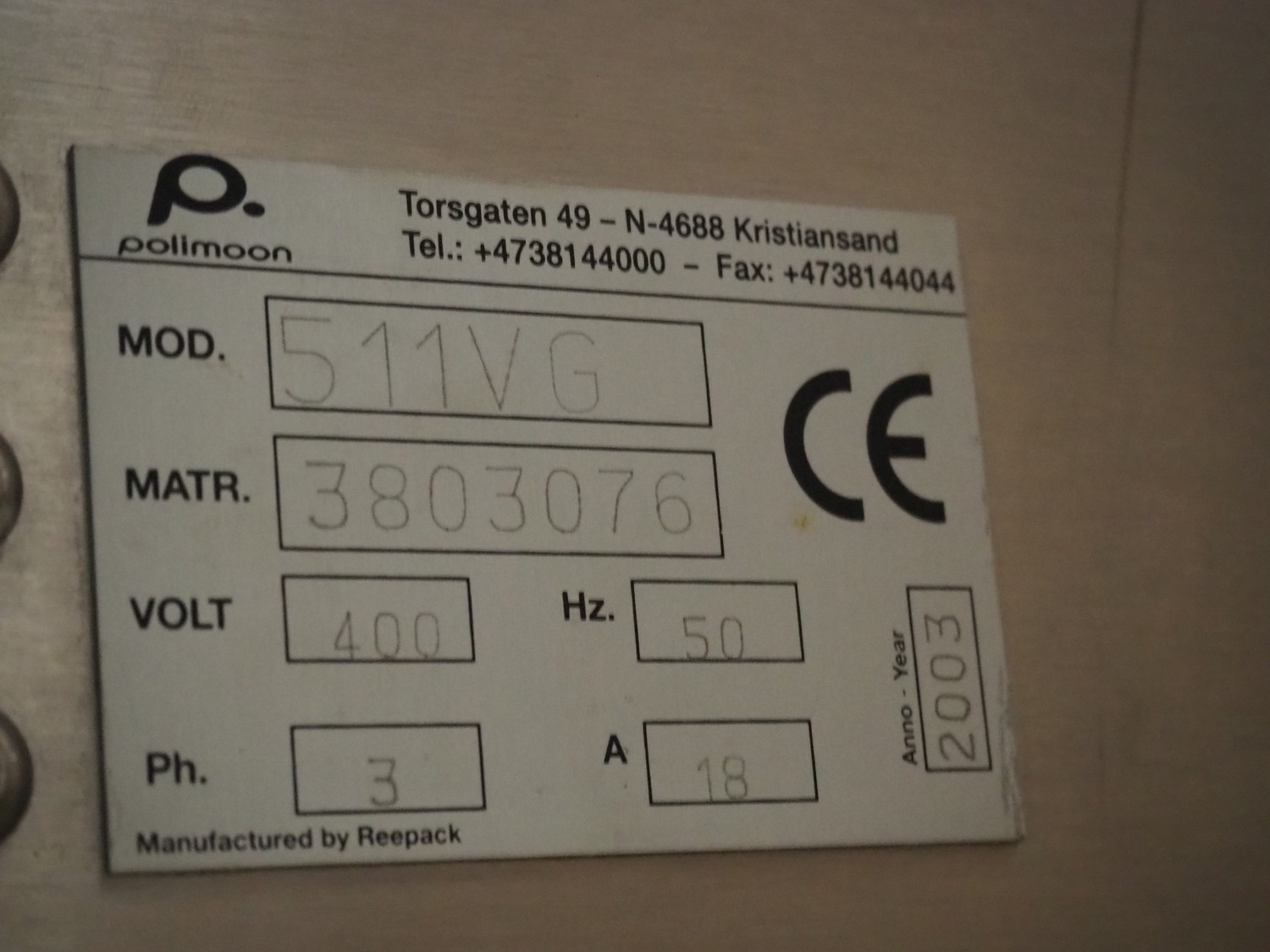 Reepack mobile tray sealer, model: 511VG, number: 3803076, year of construction: 2003, 400 V, 3 Ph, 50 Hz, 18 A, dye: 320 mm x 255 mm, film width: 360 mm, with Busch oxygen vacuum pump, type: RC 0063 E 453, number: 03026309, capacity: 63 m³ per hour, total dimensions: 950 mm x 600 mm x 1540 mm. Including 3 boxes with plastic trays, model trays: 1/2 GN 100 WH CMH 950 CTN.
