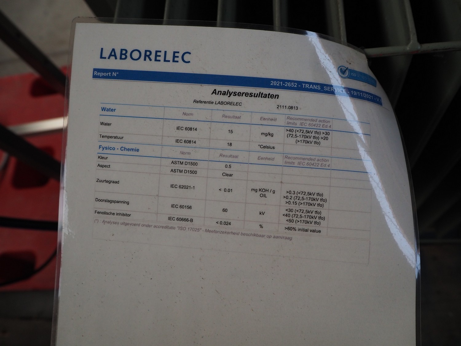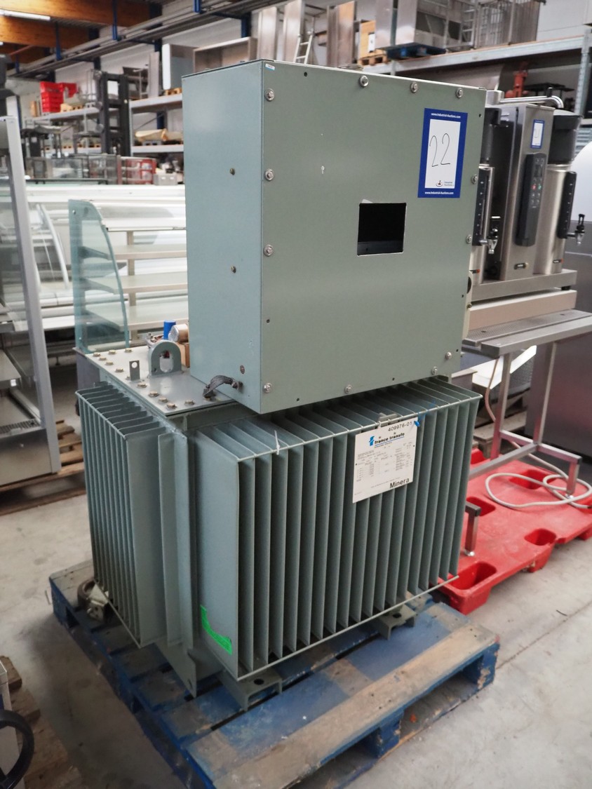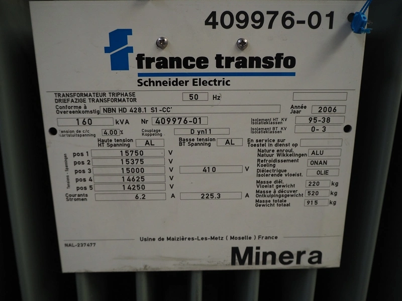 France transfo mobile transformer, type: NBN HD 428.1 S1 -CC', serial number: 409976-01, year of construction: 2006, 400 V, 225.3 A, weight: 915 kg, 160 kVA, dimensions: 800 mm x 1100 mm x 1380 mm.