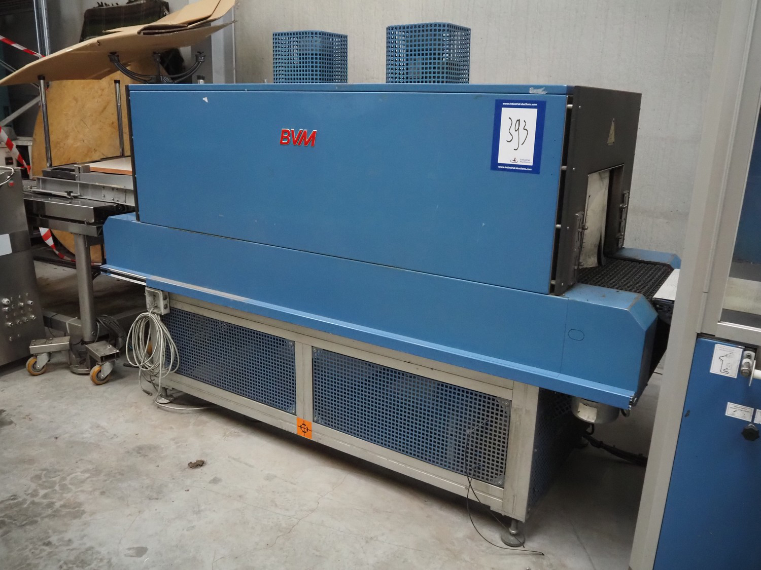 BVM Brunner GmbH u. Co.KG shrink tunnel, type: SC 4530 SD, number: 20090641882, year of construction: 2009, 400 V, 3 Ph, 50 Hz, 18 kW, plastic mesh belt, belt width: 440 mm, clearance: 450 mm x 330 mm, total dimensions: 2400 mm x 1150 mm x 1620 mm.