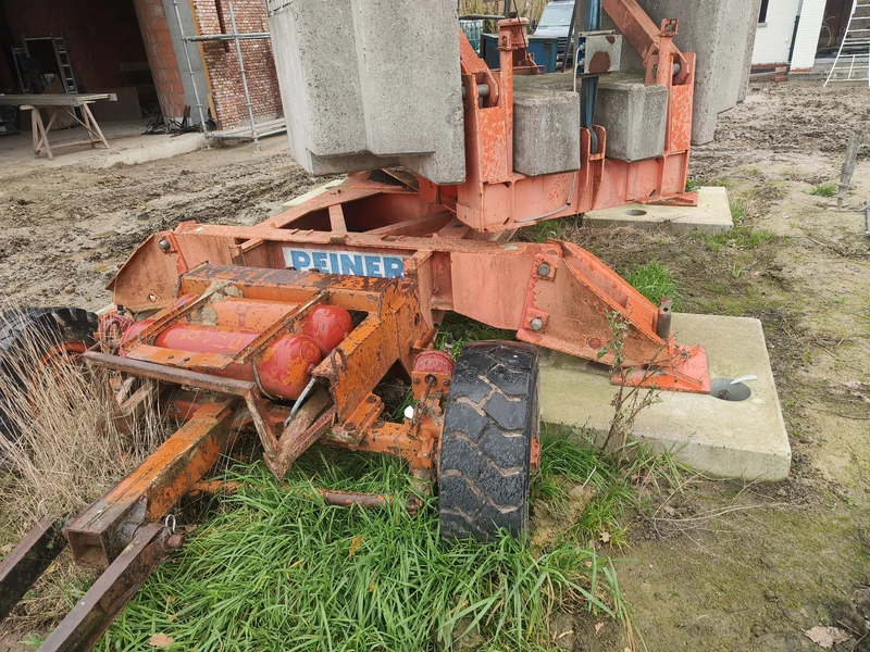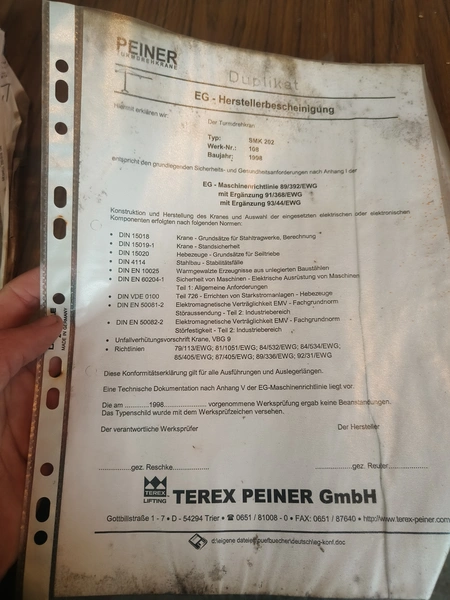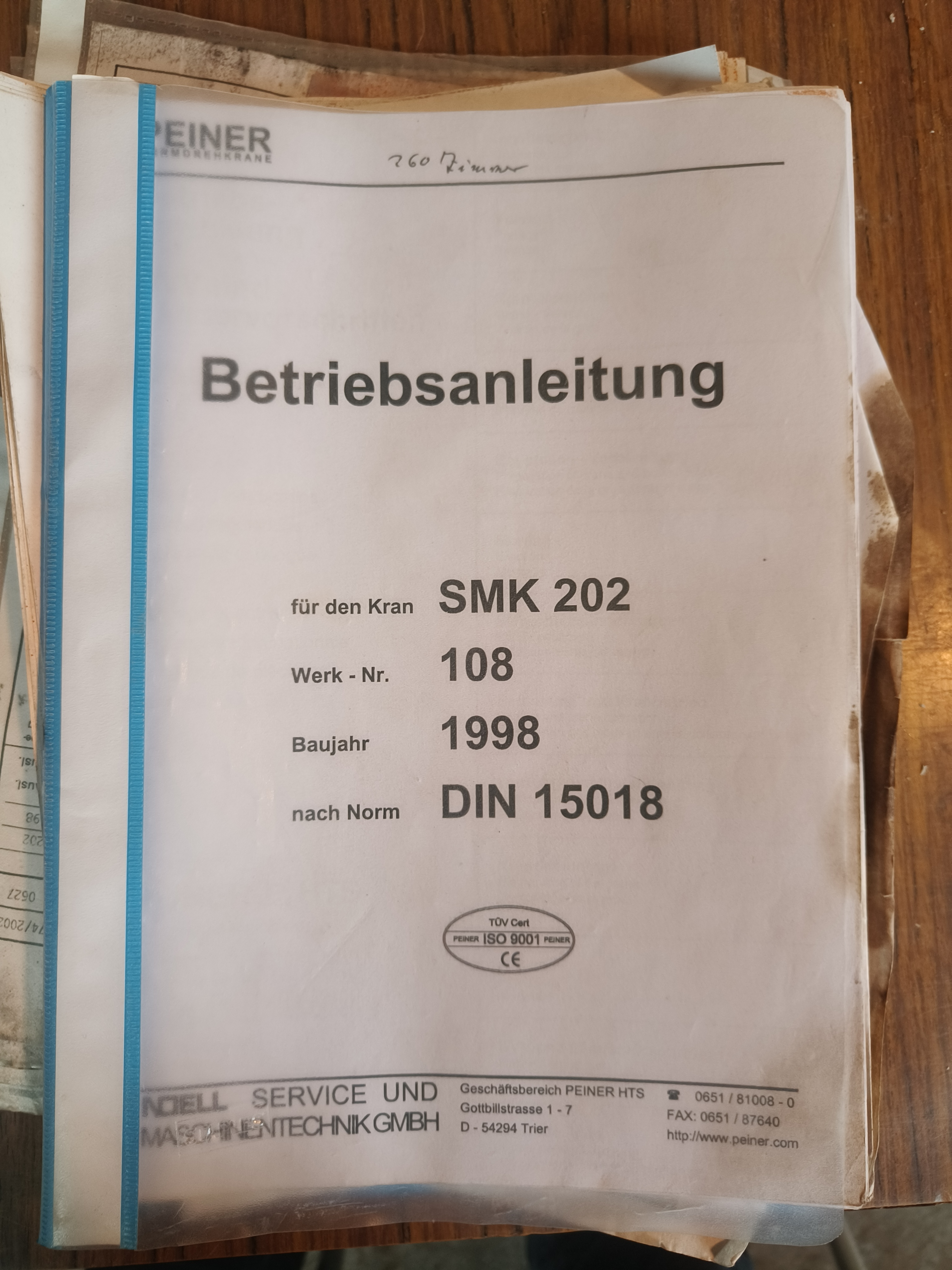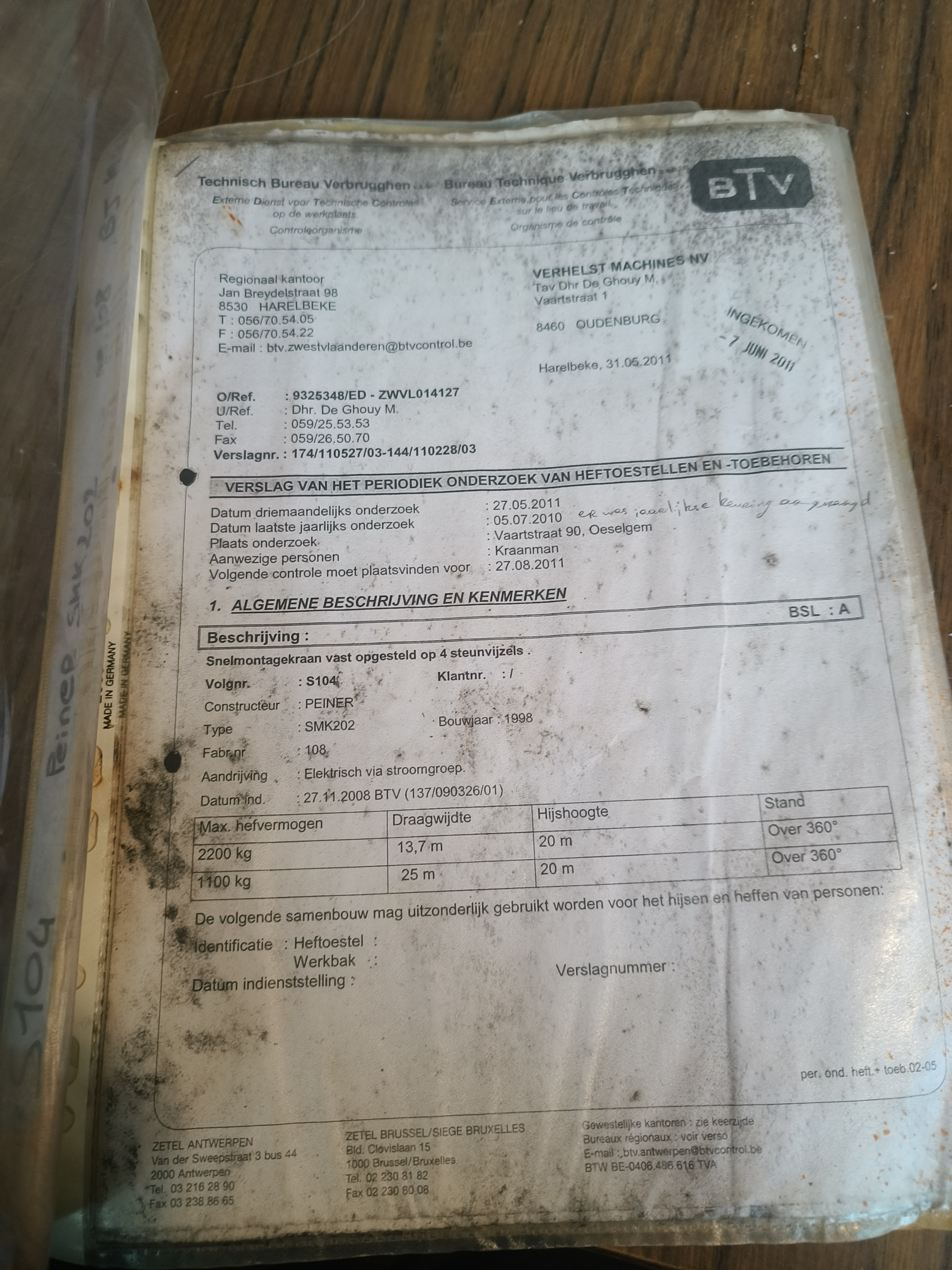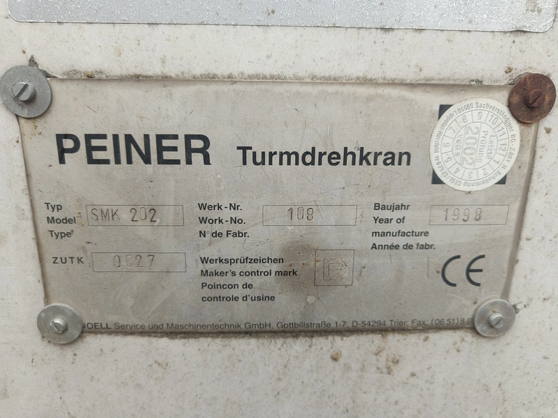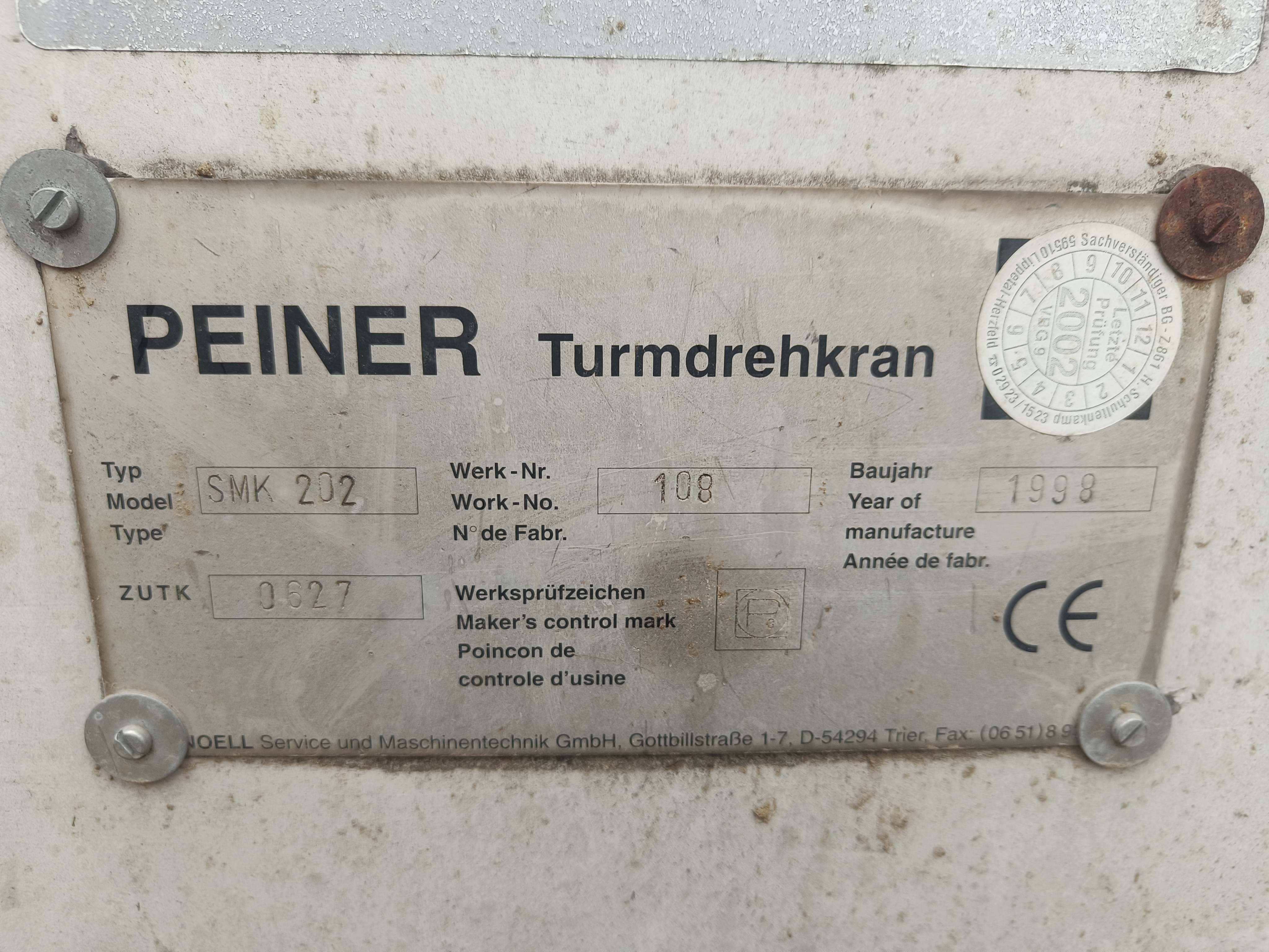 Peiner tower crane, type: SMK202, number: 108, year of construction: 1998, maximum weight: 2200 kg, maximum length: 25000 mm, lifthing height: 20000 mm, total dimensions transport: 14700 mm x 2500 mm x 3700 mm.Including extra weights: (1x) 4600 kg, (7x) 2000 kg. Lot located in Nevele (BE). Viewing and pick-up in consultation with Industrial Auctions BV.