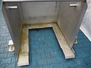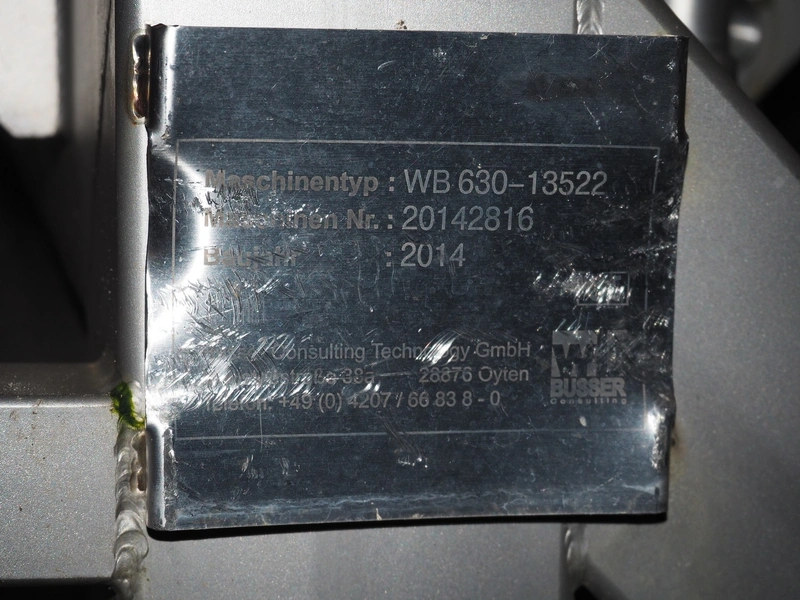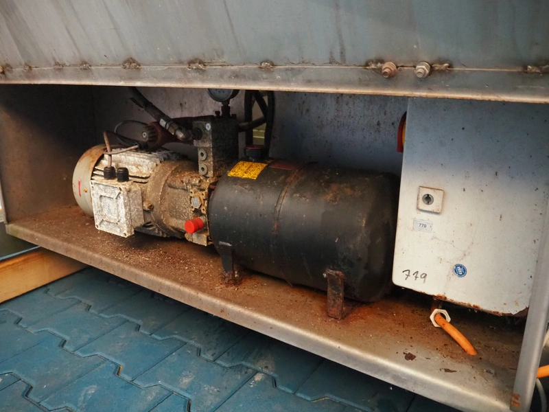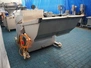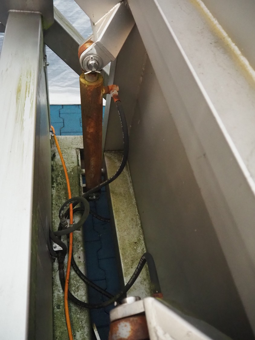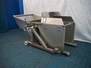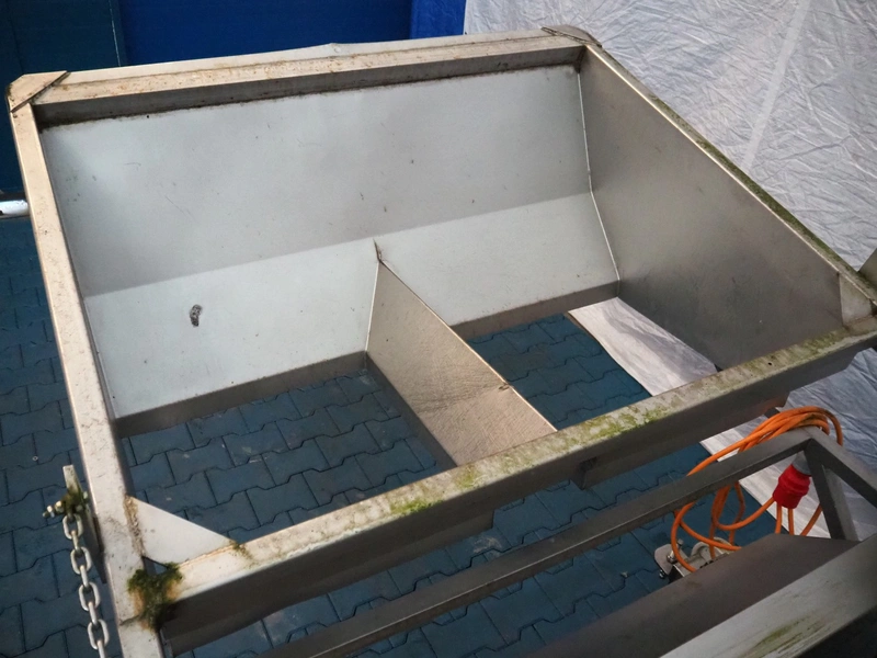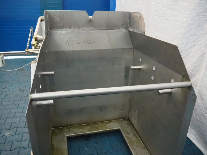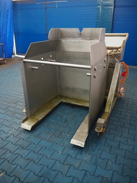 Mobile s/s tilting device for pallet boxes, tilting height: 1200 mm, total dimensions: 3000 mm x 1500 mm x 1600 mm. Wheel broken.