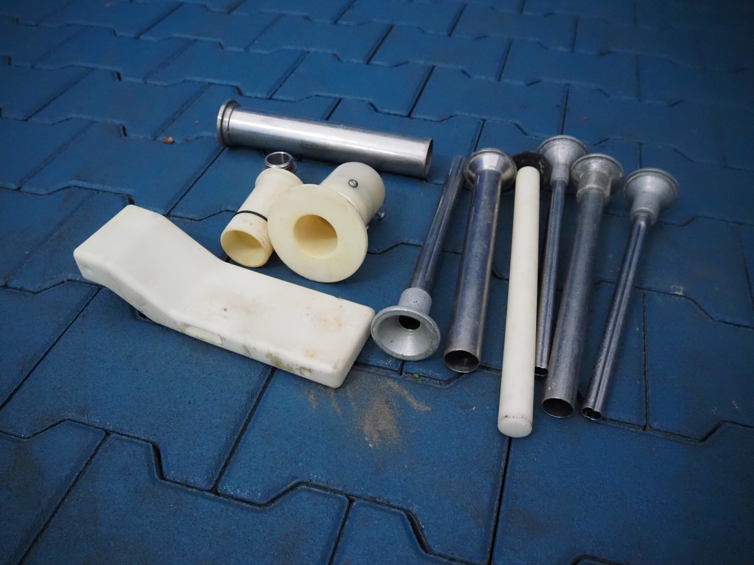 Heinrich Frey Maschinenbau piston filler, type: Kompakta 2, machine number: K2 30 08 10 90, 380 V, knee control, dimensions: 780 mm x 1000 mm x 1080 mm. Including various filling pipes.