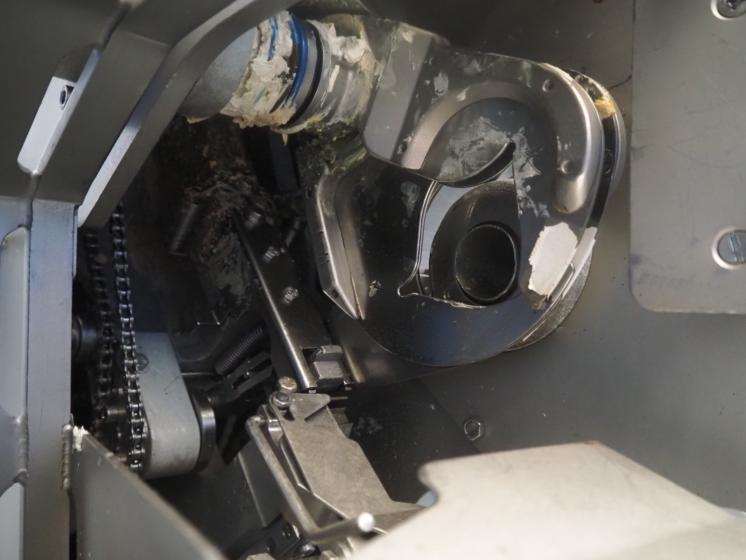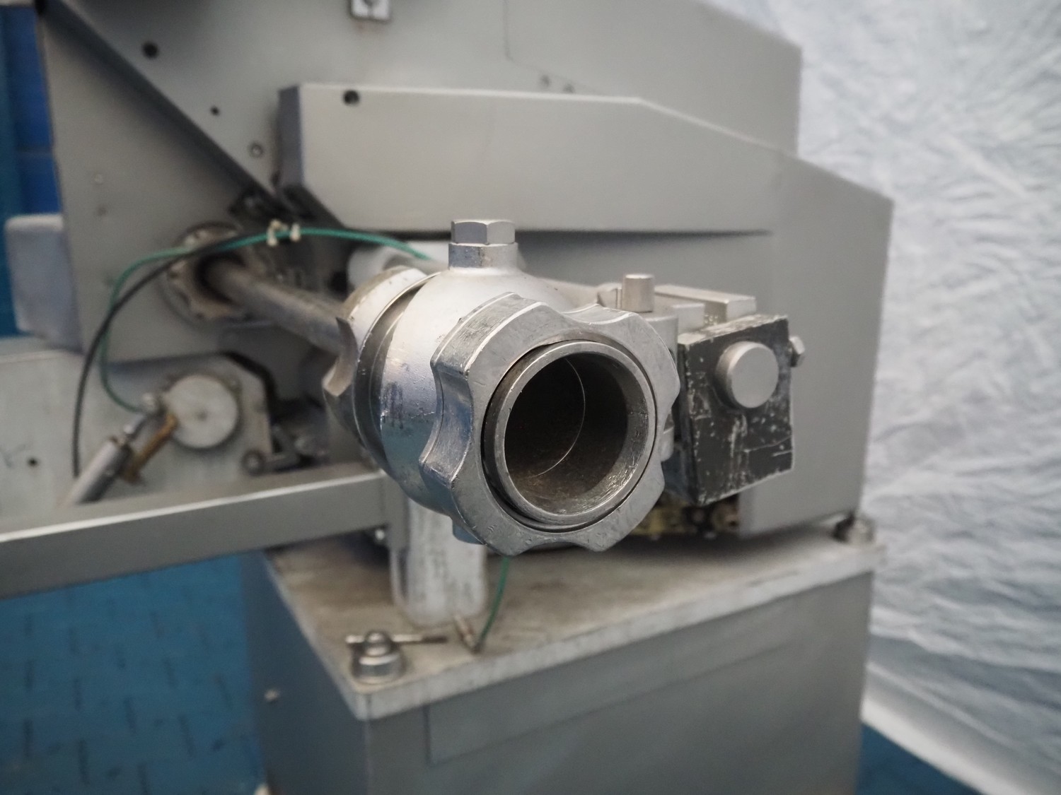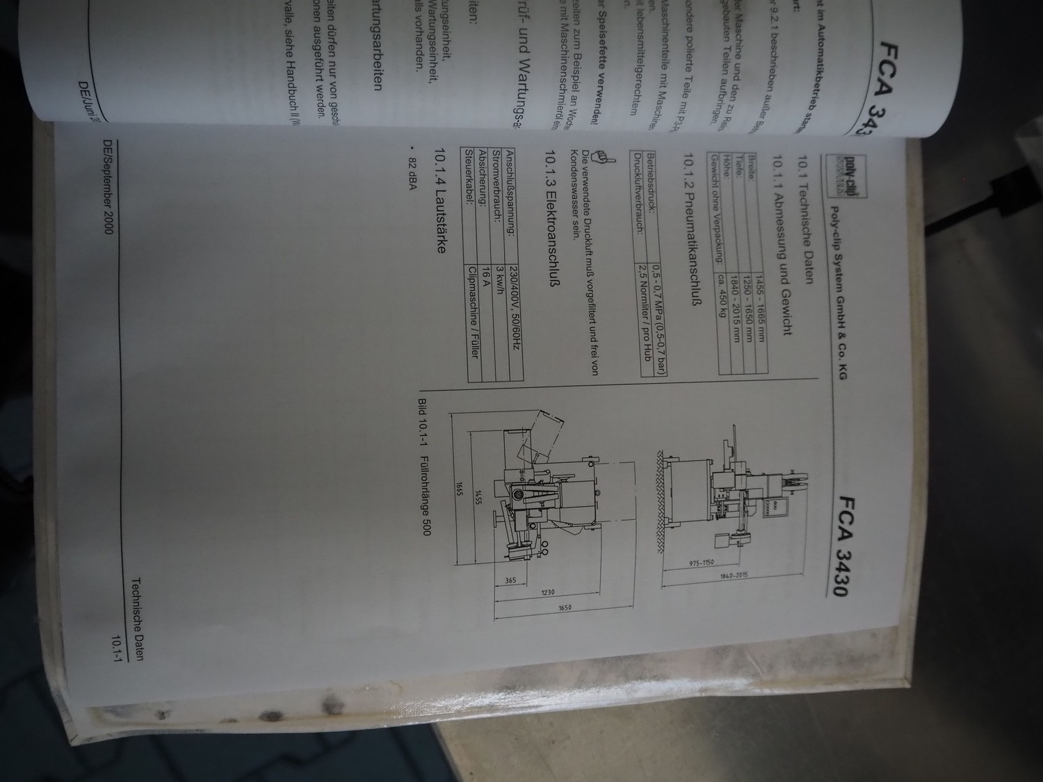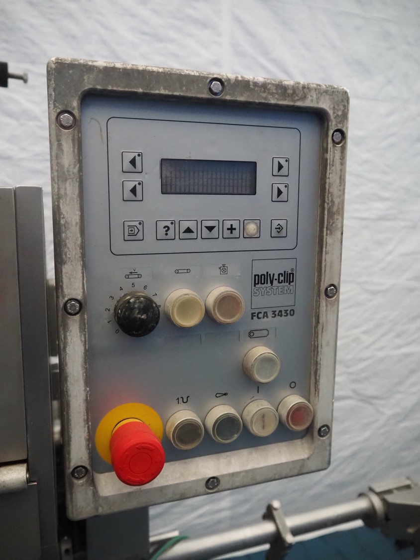 Poly-clip System GmbH & Co. KG mobile double clipper, type: FCA 3430, 230/400 V, 50/60 Hz, 16 A, 3 kW, dimensions: 1600 mm x 1450 mm x 2000 mm. Missing front wheel.