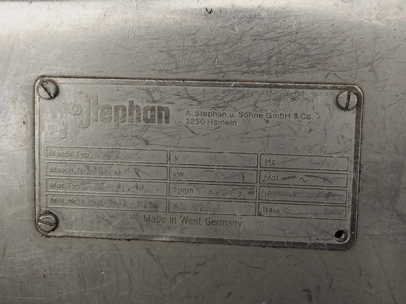 Stephan universal mixer, type: VM450, machine number: 35451, year of construction: 1984, 380 V, 3 Ph, 50 Hz, 4 kW, dimensions: 2150 mm x 2000 mm x 2880 mm.
