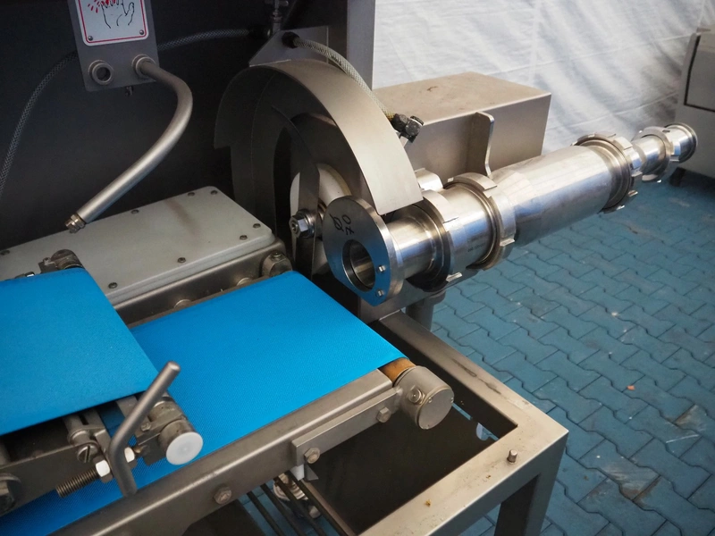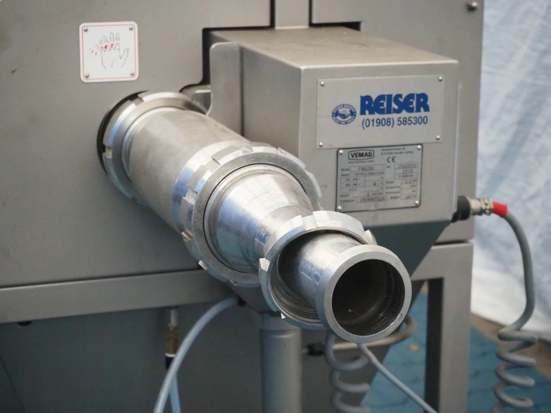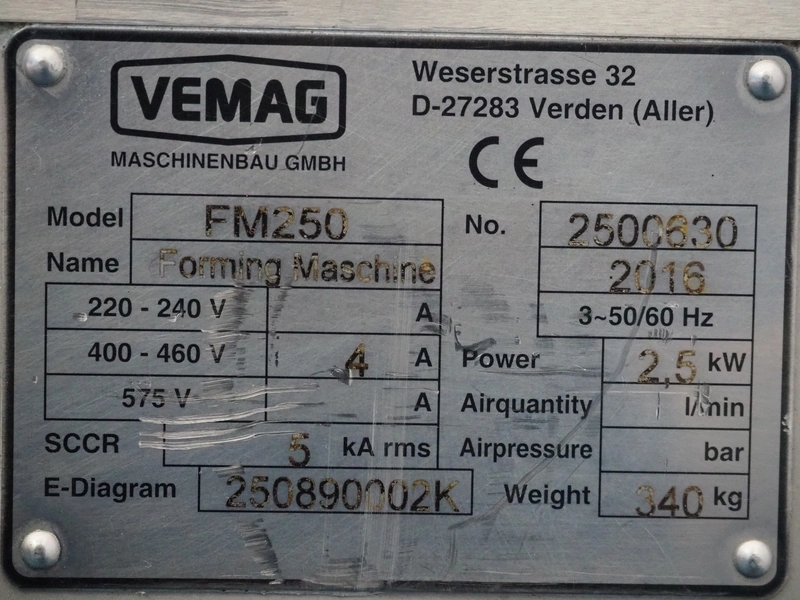 Vemag mobile hamburger forming machine, model: FM250, number: 2500630, year of construction: 2016, 400-460 V, 3 Ph, 50/60 Hz, 4 A, 2.5 kW, diameter clearance: 70 mm, plastic belt, belt width: 250 mm, total dimensions: 2100 mm x 860 mm x 1550 mm.