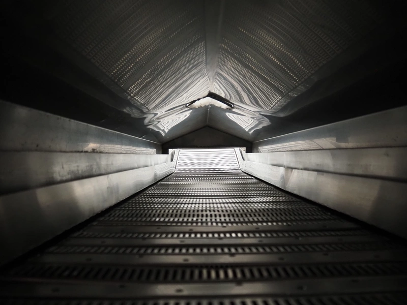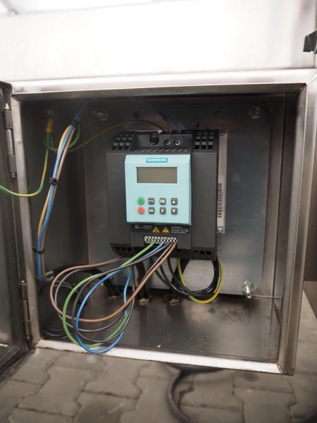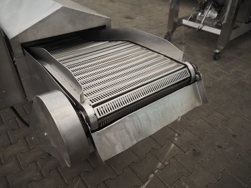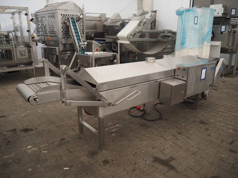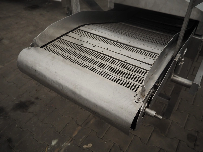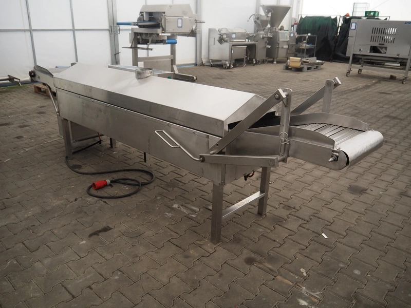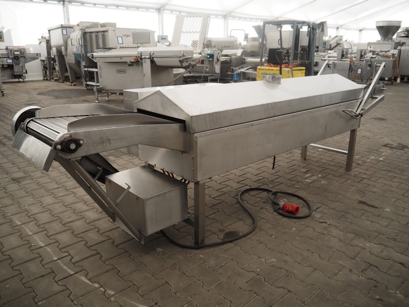 Skov & Weidemann frying belt, s/s belt, belt width: 440 mm, clearance: 440 mm x 70 mm, total dimensions: 3750 mm x 900 mm x 1280 mm.