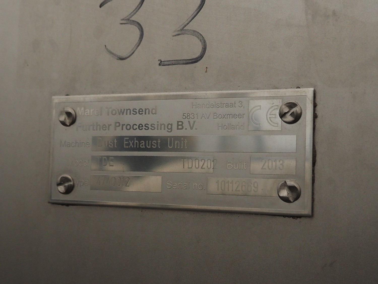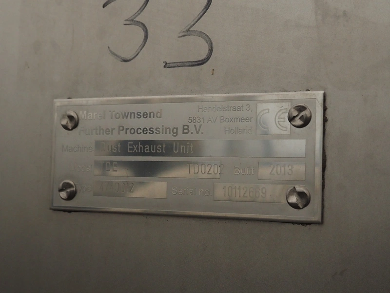 Marel Townsend Further Processing B.V. mobile vacuum cleaner, machine: Dust Exhaust Unit, model: TDE TDO 202, type: 4/40012, serial number: 10112666, year of construction: 2013, dimensions: 900 mm x 1600 mm x 1650 mm. Incomplete, missing drum.