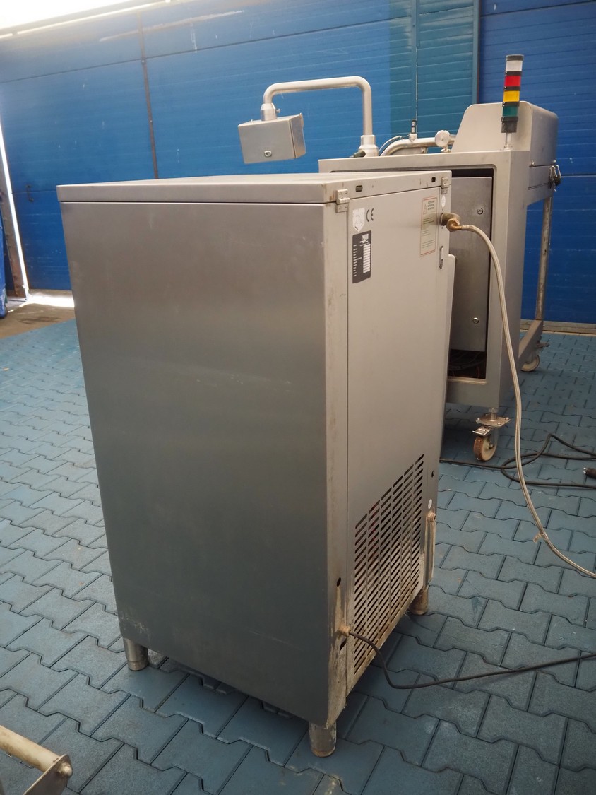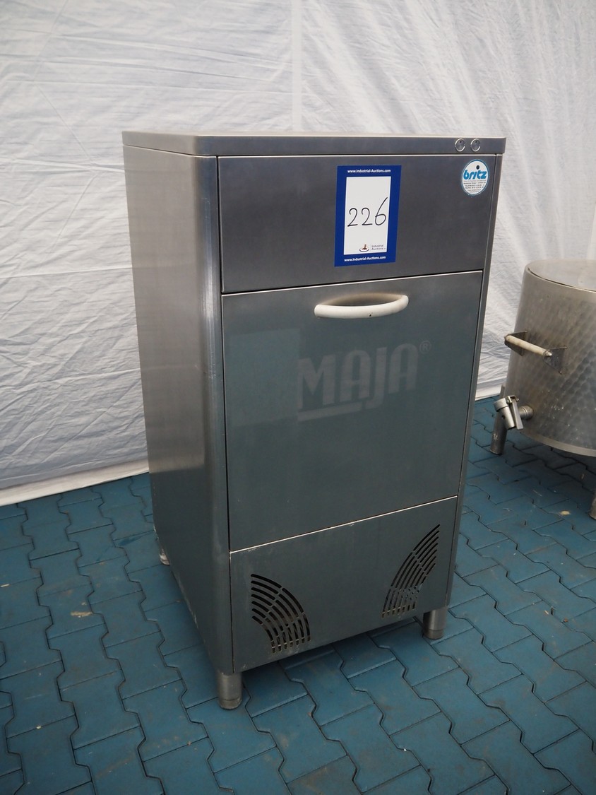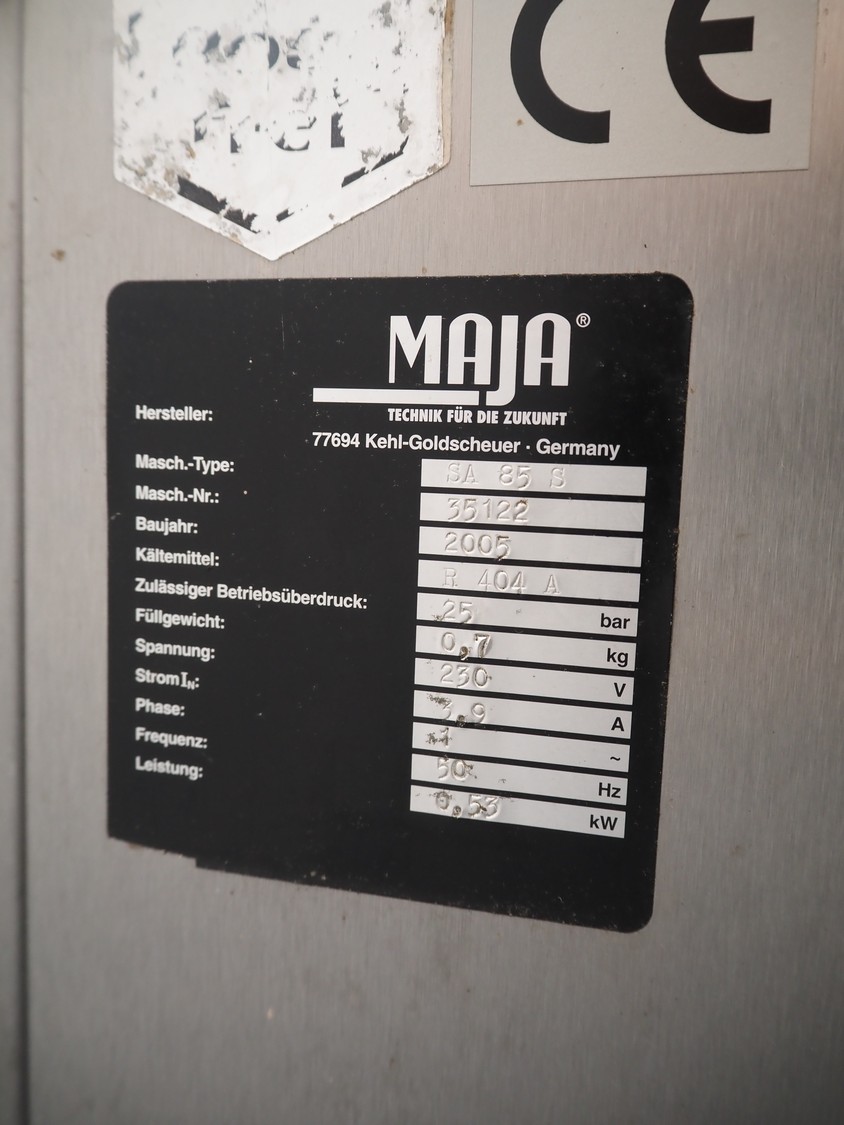 Maja flake-ice machine, type: SA 85 S, number: 35122, year of construction: 2005, 230 V, 50 Hz, 3.9 A, 0.53 kW, refrigerant: R 404 A, capacity: 85 kg per 24 hours, dimensions: 700 mm x 700 mm x 1350 mm.