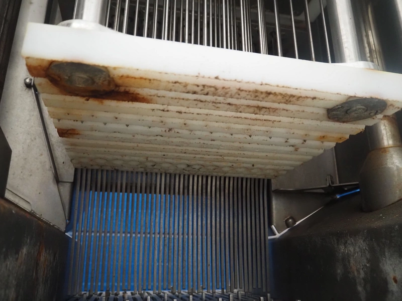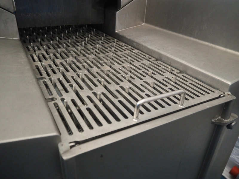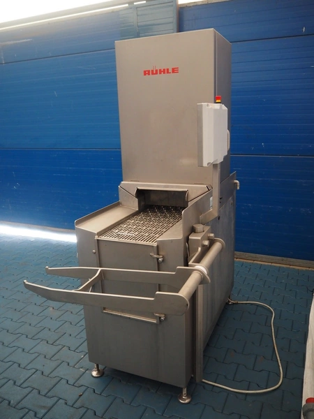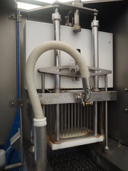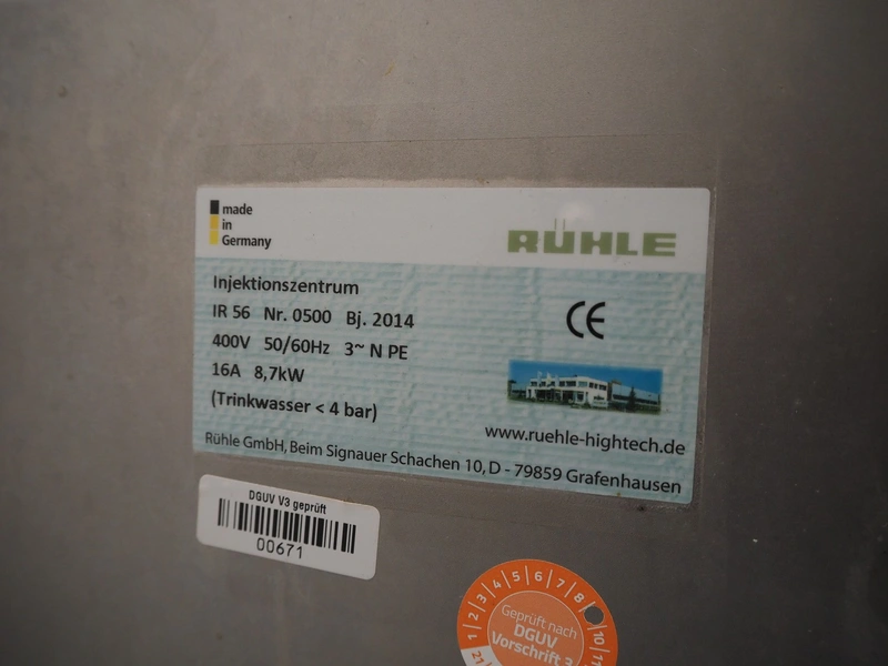 Rühle injector with lifter for crates, type: IR 56, number: 0500, year of construction: 2014, 400 V, 3 Ph, 50/60 Hz, 16 A, 8.7 kW, s/s walking beam, walking beam width: 350 mm, clearance: 350 mm x 170 mm, 56 needles, dimensions: 1800 mm x 1000 mm x 2100 mm.