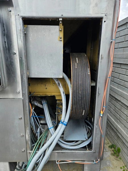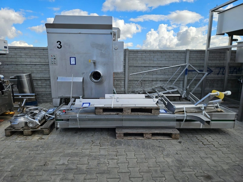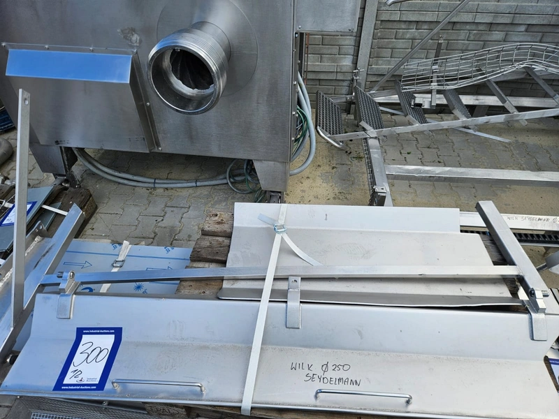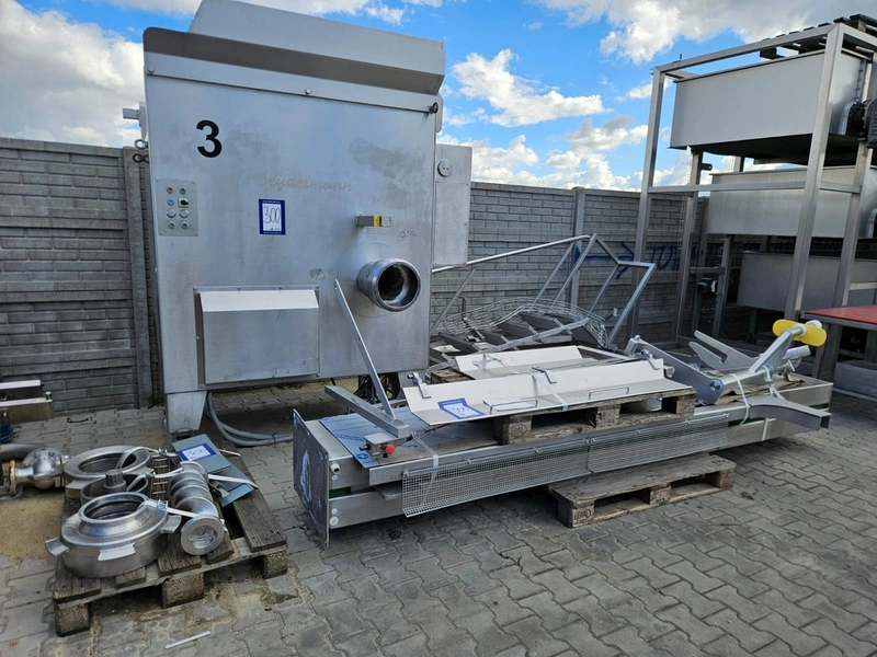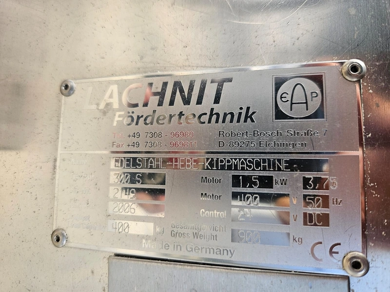 Seydelmann grinder with Lachnit lifter for meat bins, model: AV 250 K, machine number: 06088-1, year of construction: 2006, 400 V, 50 Hz, 147 A, 82 kW, plate diameter: 250 mm, total dimensions grinder: 2000 mm x 1650 mm x 2500 mm, type Lachnit: 300 S, serial number: 2149, year of construction: 2006, 400 V, 50 Hz, 3.75 A, 1.5 kW, weight: 900 kg, capacity: 400 kg, dimensions lifter: 1550 mm x 500 mm x 3550 mm, dimensions switch cabinet: 1200 mm x 550 mm x 2150 mm.
