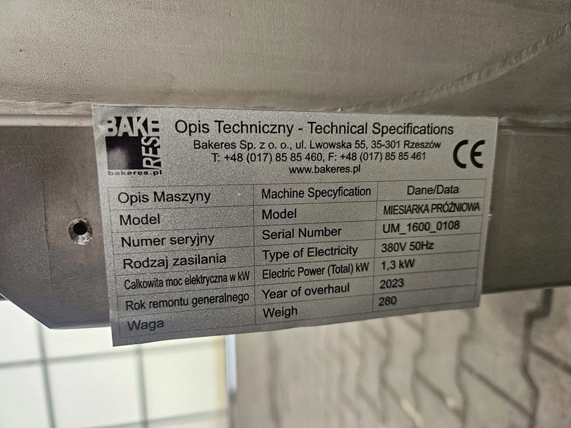Bakeres Sp. z o.o vacuum paddle mixer, model: MIESIARKA PRÓZNIOWA, serial number: UM_1600_0108, year of revision: 2023, 230 V, 50 Hz, 1.3 kW, weight: 280 kg, volume: 400 liter, dimensions: 1600 mm x 1150 mm x 1450 mm. Without vacuum pump.