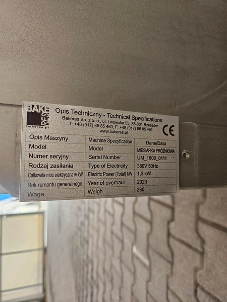 Bakeres Sp. z o.o vacuum paddle mixer, model: MIESIARKA PRÓZNIOWA, serial number: UM_1600_0111, year of construction: 2023, 230 V, 50 Hz, 1.3 kW, weight: 280 kg, volume: 400 liter, dimensions: 1600 mm x 1150 mm x 1450 mm.