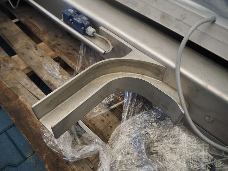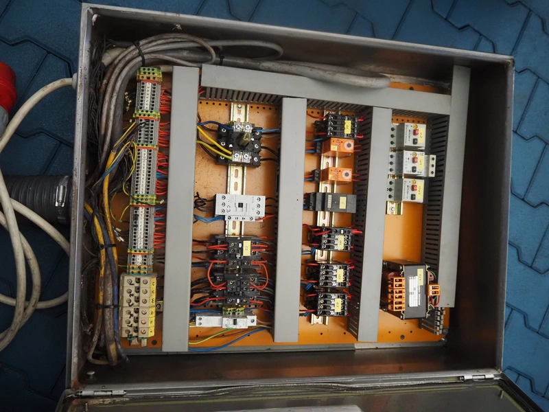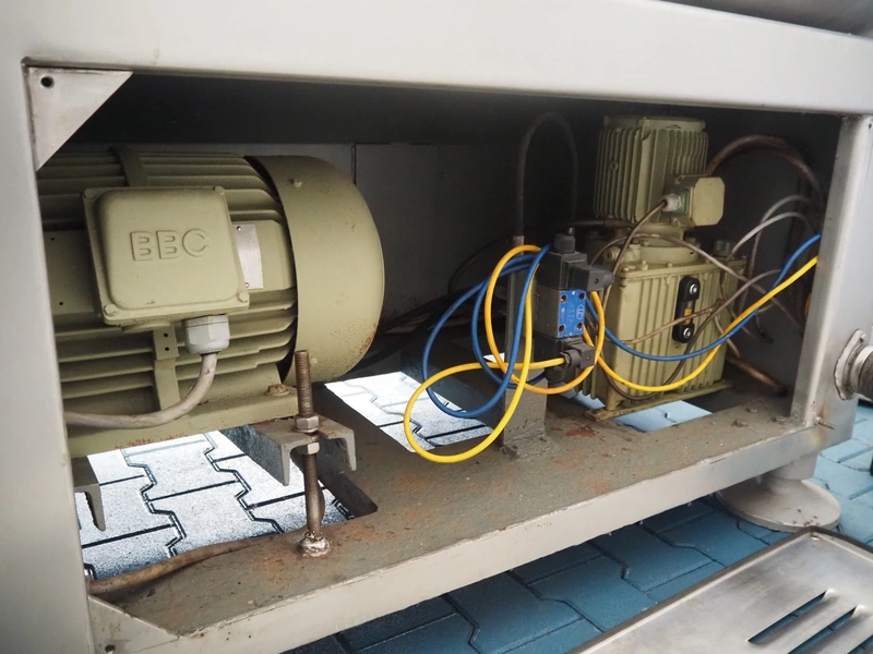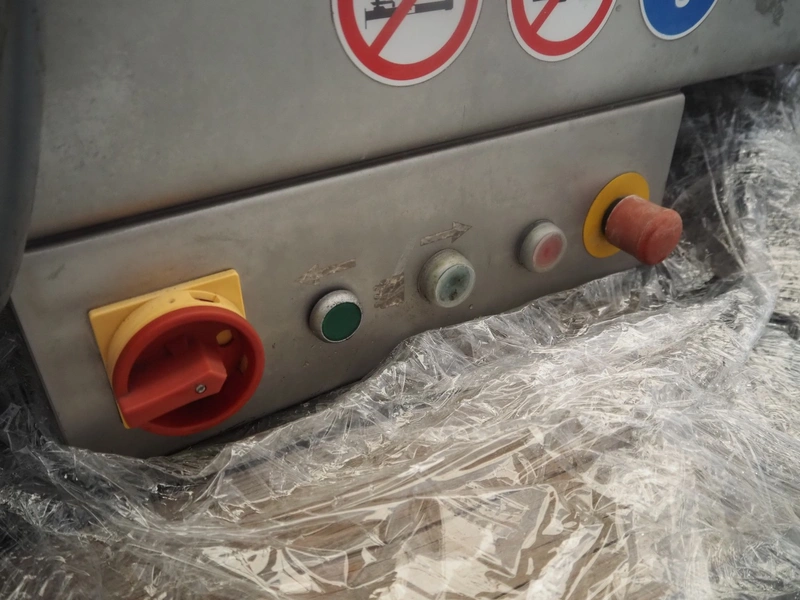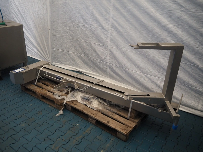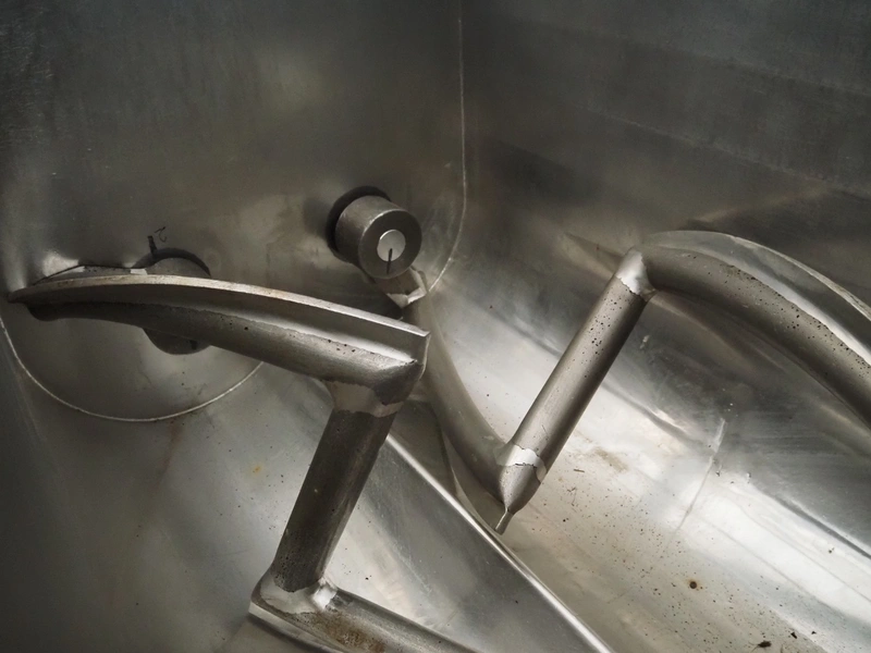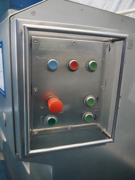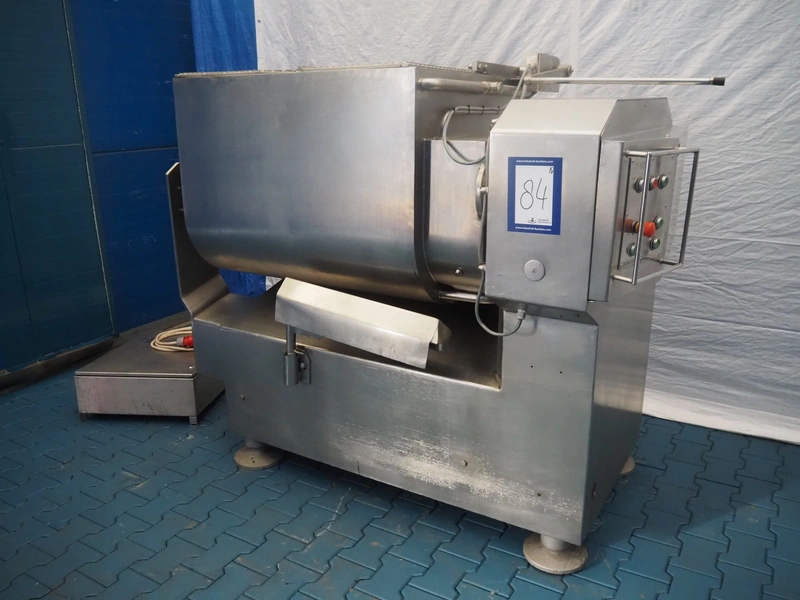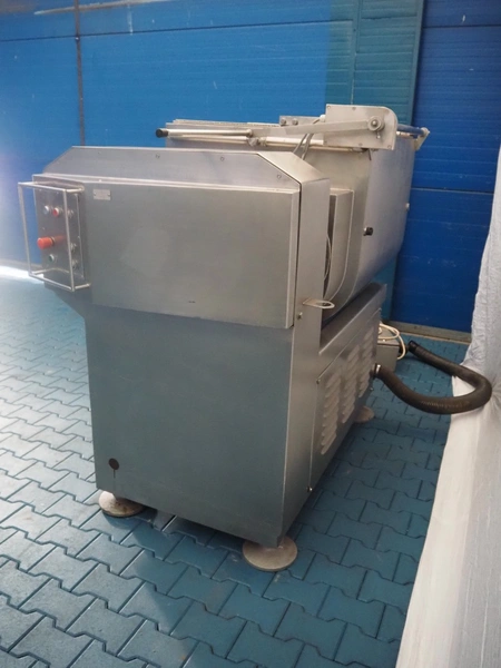 Laska double shaft z-arm mixer, type: V952, double jacketed, inside dimensions: 1010 mm x 760 mm x 700 mm, total dimensions: 1970 mm x 1050 mm x 1620 mm. Including switch cabinet, dimensions: 600 mm x 260 mm x 750 mm and N&N lifter for 200 liter meat bins, lifting height: 1800 mm, capacity: 250 kg, total dimensions lifter: 1180 mm x 800 mm x 2980 mm.