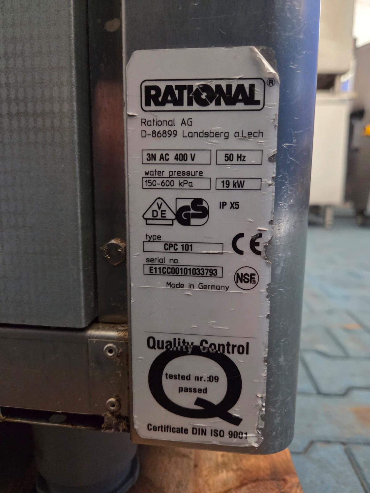 Rational combisteamer, type: CPC 101, serial number: E11CC00101033793, year of construction: 2000, 400 V, 3 Ph, 50 Hz, 19 kW, electrically heated, dimensions: 900 mm x 800 mm x 1100 mm.
