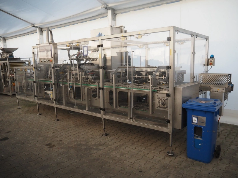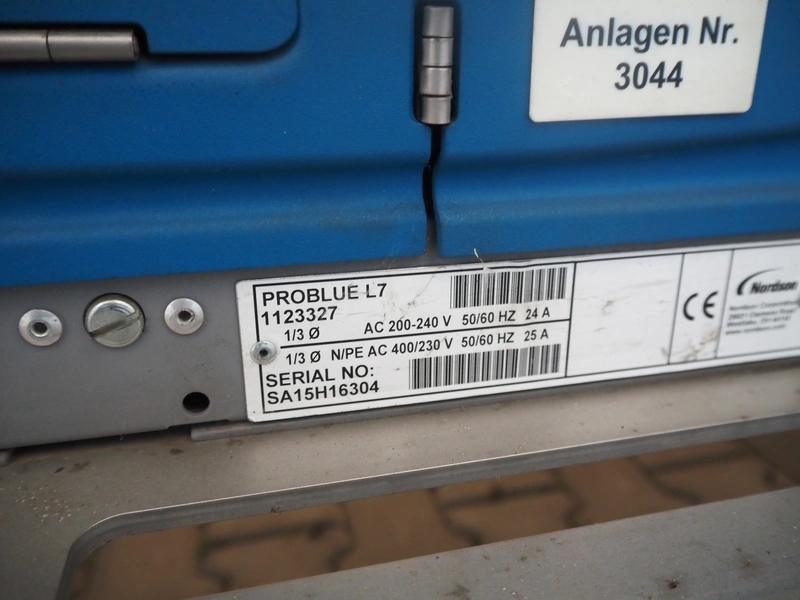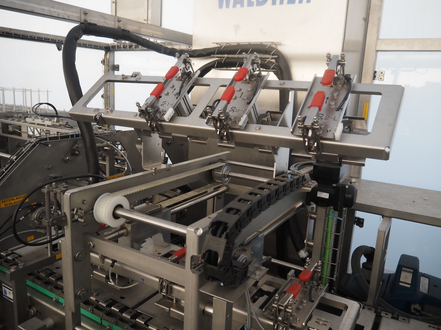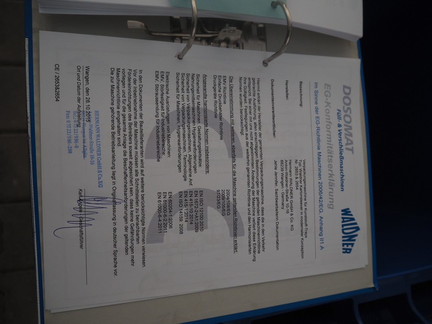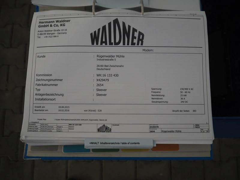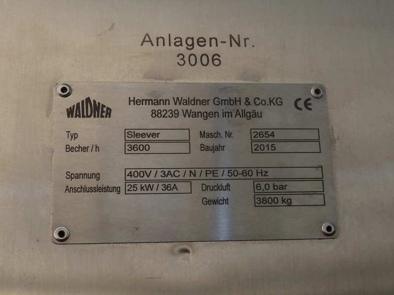 Waldner sleever, type: Sleever, machine number: 2654, year of construction: 2015, 400 V, 3 Ph, 50/60 Hz, 36 A, 25 kW, 6.0 bar, weight: 3800 kg, jars/cups per hour : 3600, NORDSON glue unit, type: PROBLEU L7, Busch vacuum pump, type: SV 1040 C 000 INXX, dimensions: 5950 mm x 1900 mm x 2500 mm.