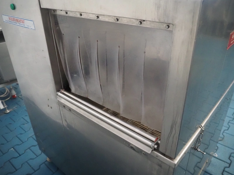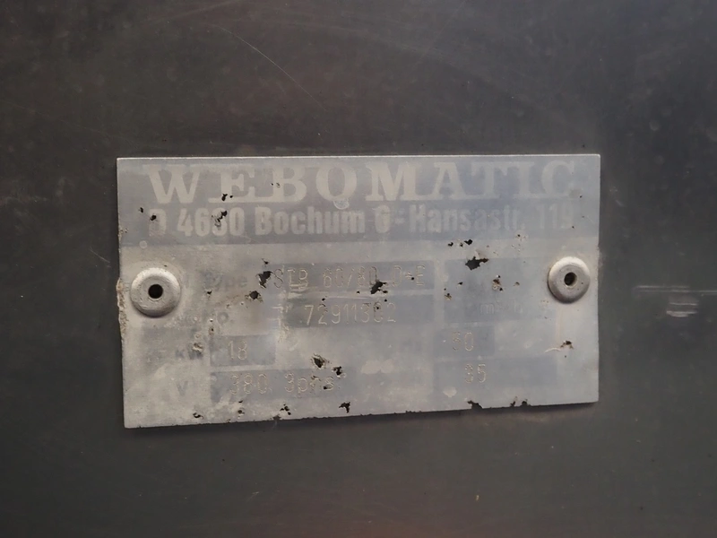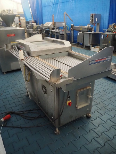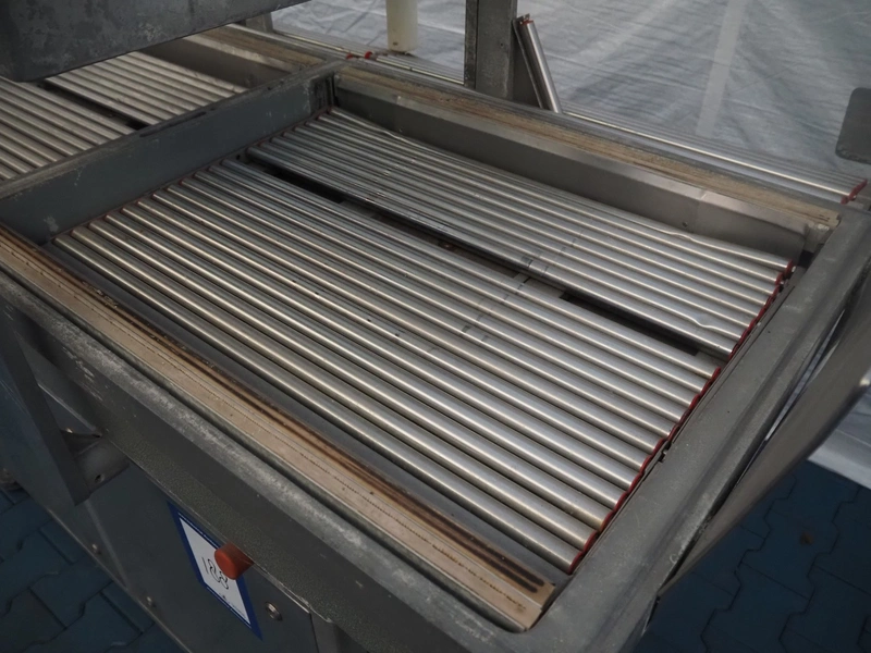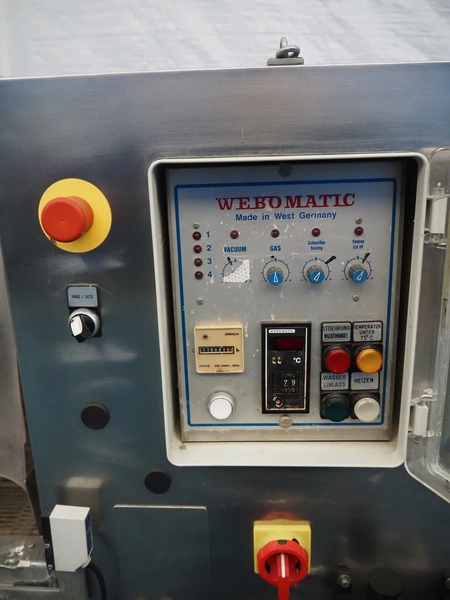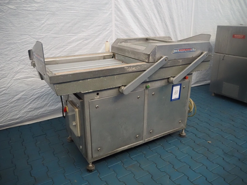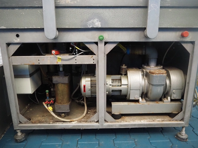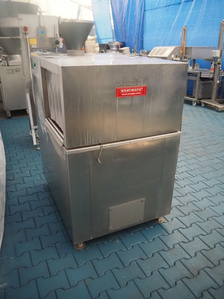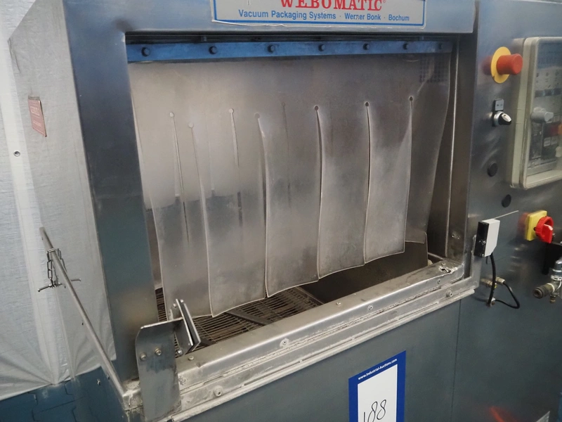 Webomatic packaging line, consisting of: Webomatic double chamber vacuum machine, type: PNC 20A-D-M2, machine number: 555912033, 220/380 V, 50 Hz, 3.5 A, Busch roots vacuum pump, seal length: (2x) 800 mm, chamber dimensions: 800 mm x 600 mm, total dimensions: 2000 mm x 1100 mm x 1350 mm; Webomatic shrinking tunnel, type: STP 60/80 D+E, number: 72911302, 380 V, 3 Ph, 50 Hz, 35 A, dimensions: 1300 mm x 900 mm x 1400 mm; s/s roller conveyor, dimensions: 2000 mm x 700 mm x 800 mm.