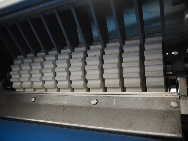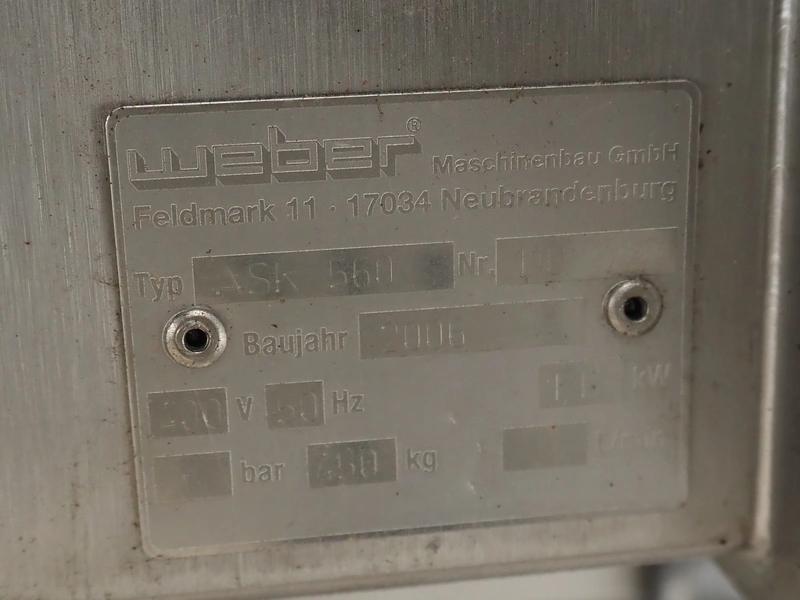 Weber mobile skinning and strip cutting machine, type: ASL 560, number: 366, year of construction: 2012, 400 V, 50 Hz, 11 kW, weight: 550 kg, plastic belt, belt width: (1x) 500 mm, (1x) 300 mm, 17 knives, distance between knives: 30 mm, total dimensions: 2200 mm x 1300 mm x 1800 mm. Including extra parts and knives.