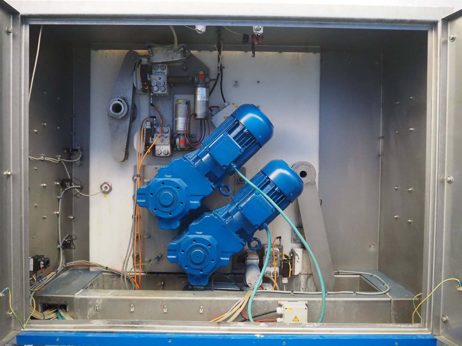 Günther Maschinenbau GmbH mobile steaker presser, type: GTP 600, serial number: 34477, year of construction: 2015, 400 V, 16 A, 4.5 kW, plastic belt, belt width: 595 mm, working width: 570 mm, total dimensions: 2250 mm x 2050 mm x 2050 mm.