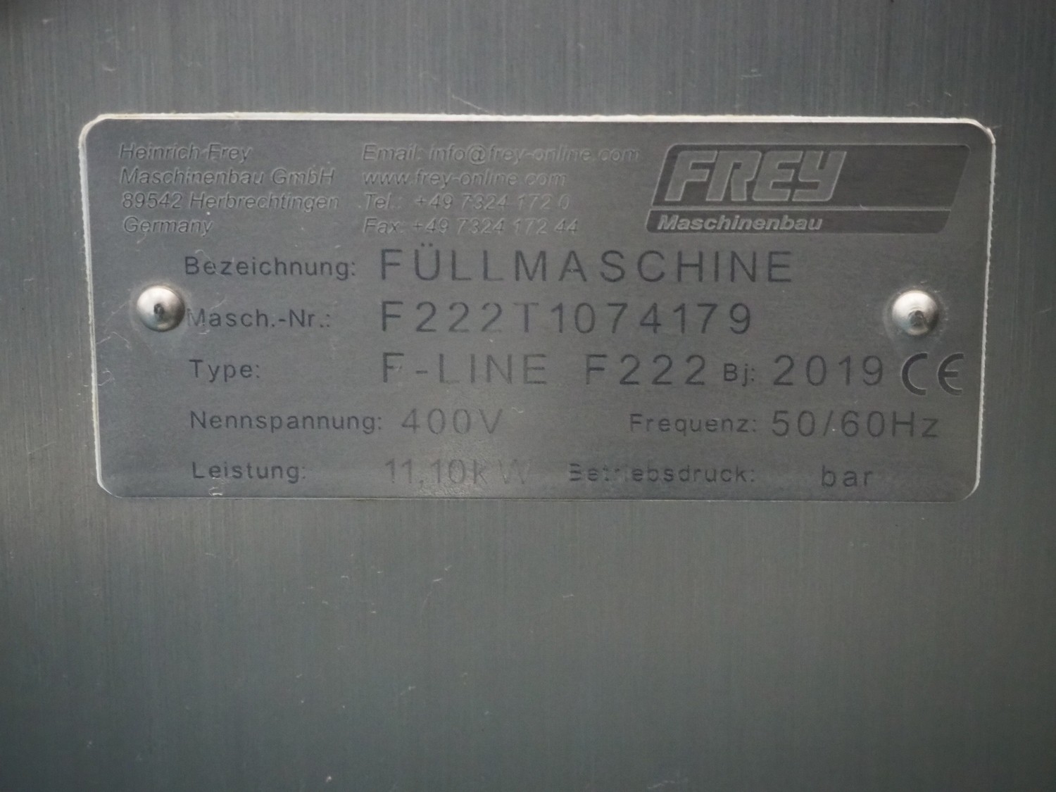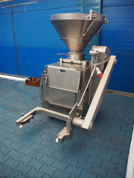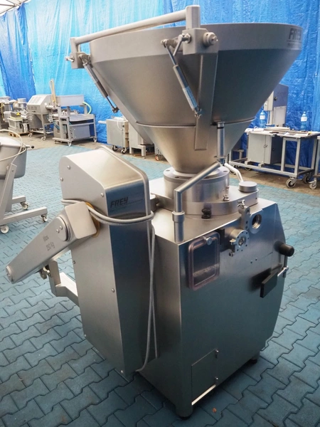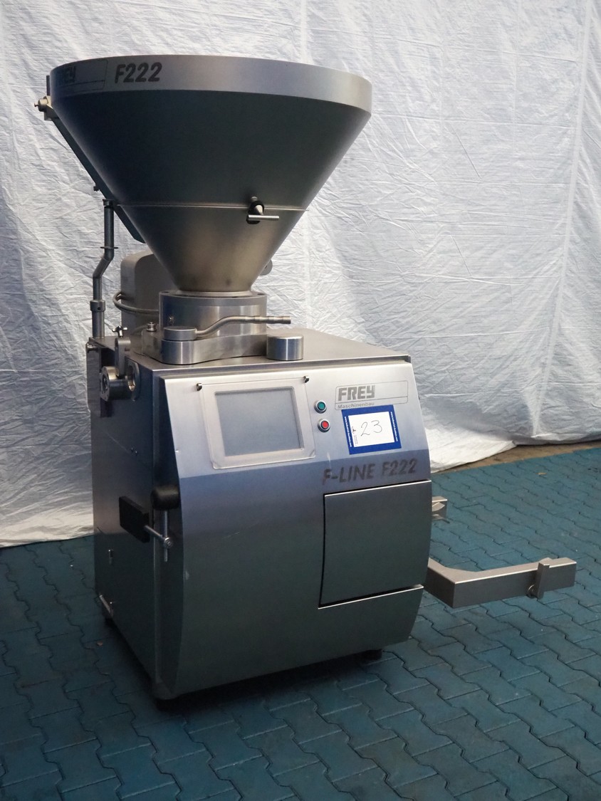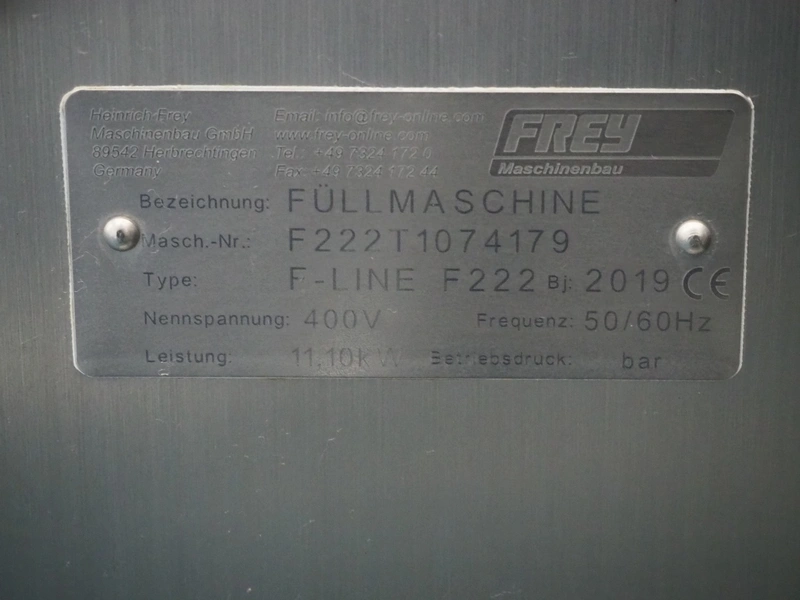 Frey Maschinenbau GmbH vacuum filling machine with lifter for 200 liter meat bins, type: F-LINE F222, machine number: F222T1074179, year of construction: 2019, 400 V, 50/60 Hz, 11.10 kW, dimensions: 2000 mm x 1340 mm x 1980 mm. Including crate with parts.