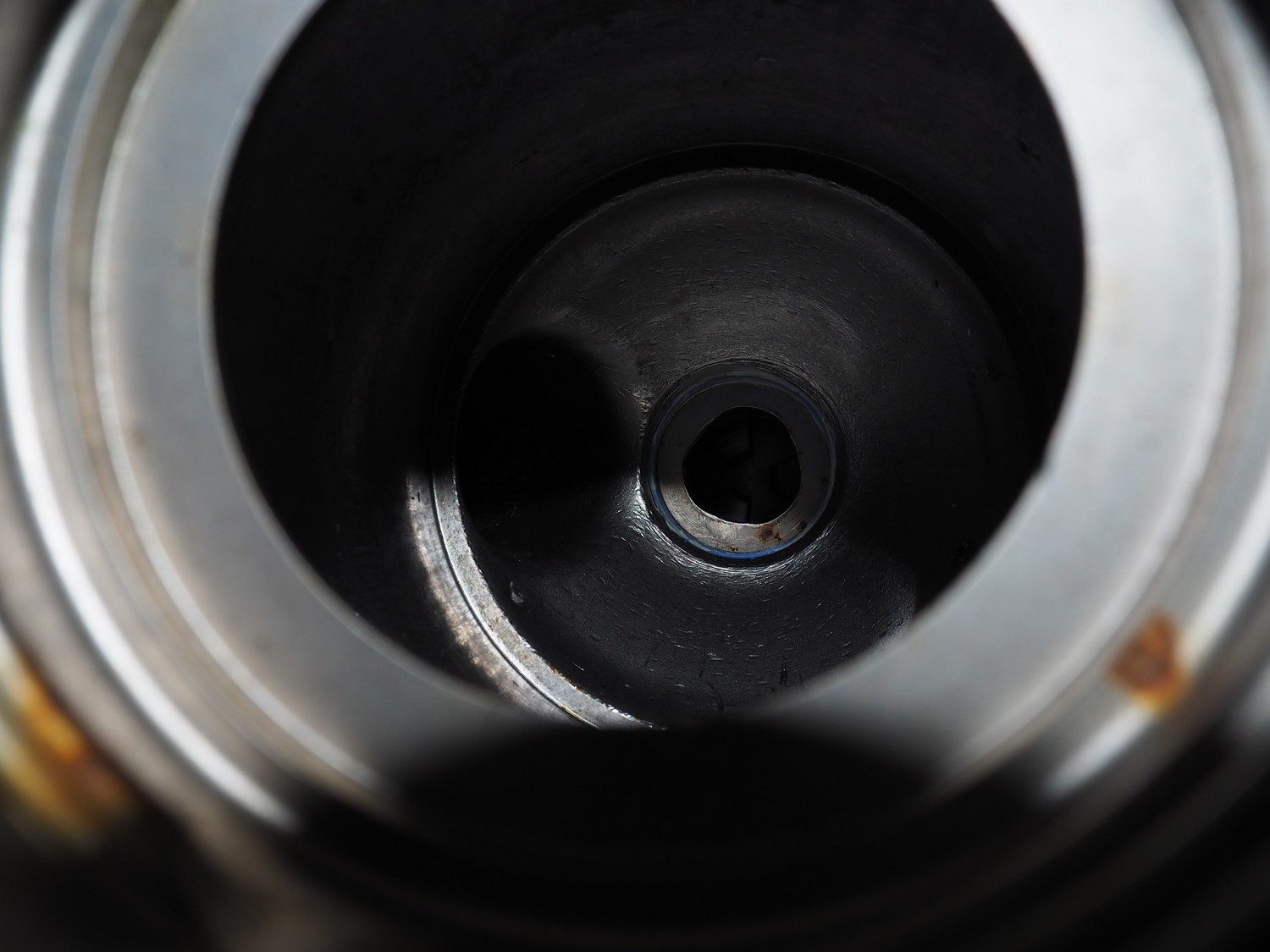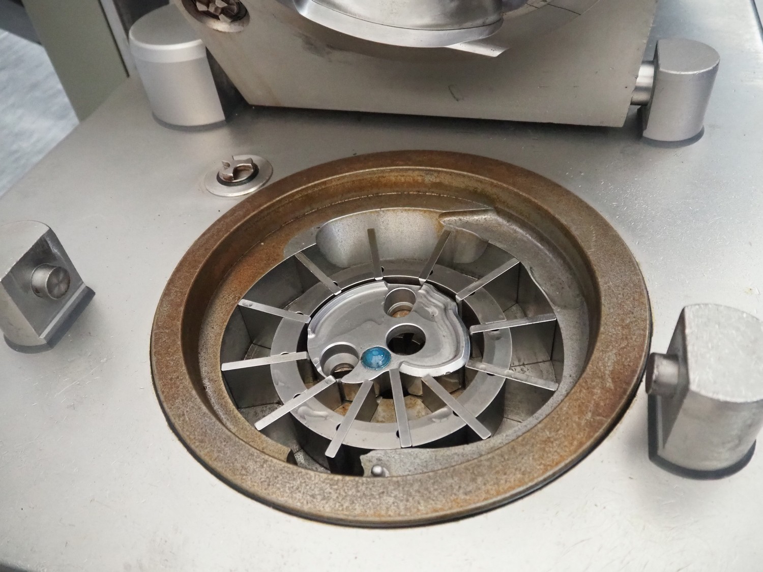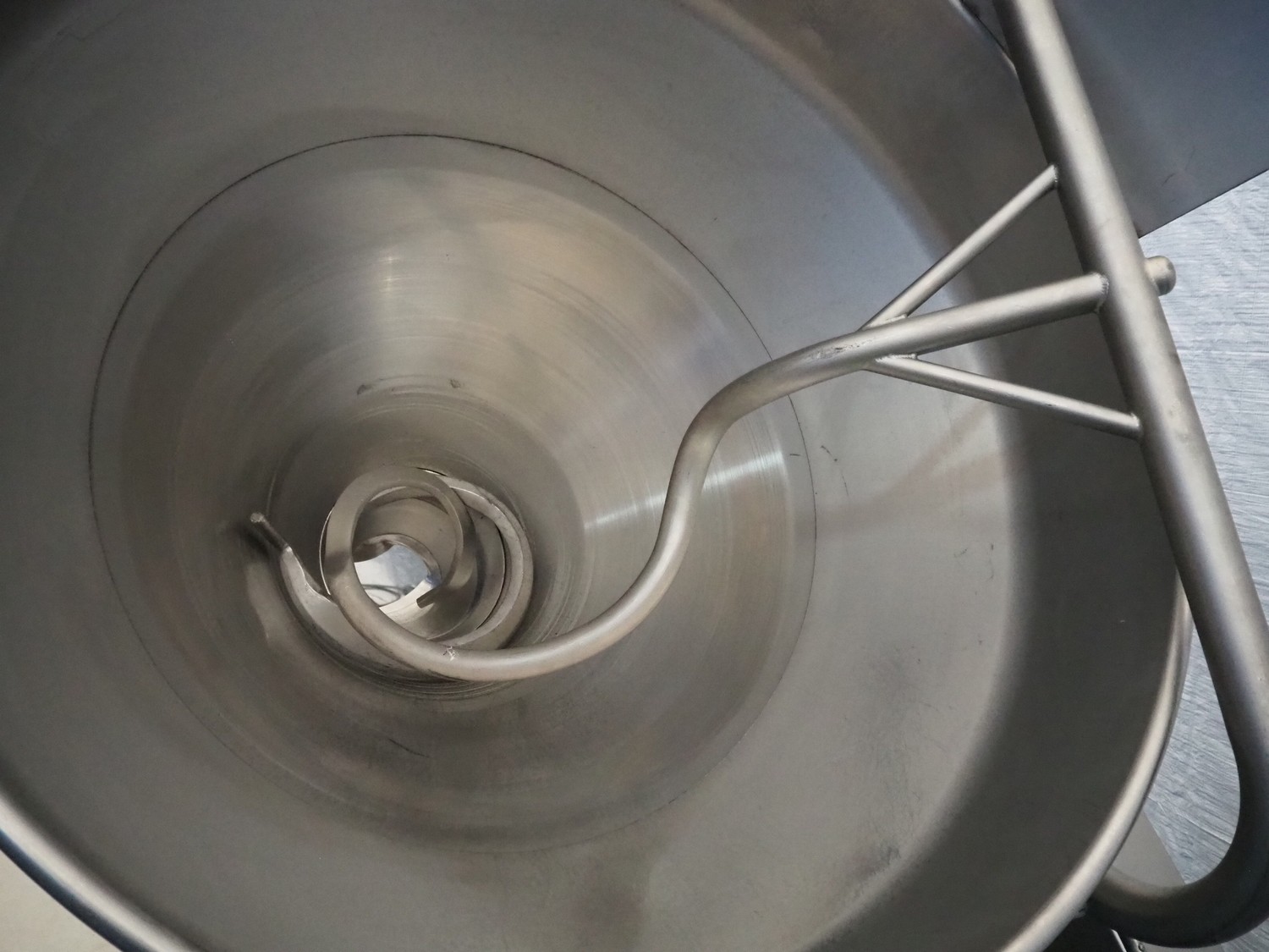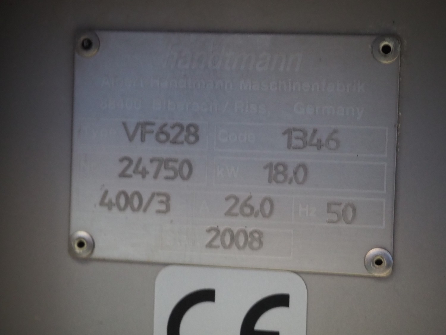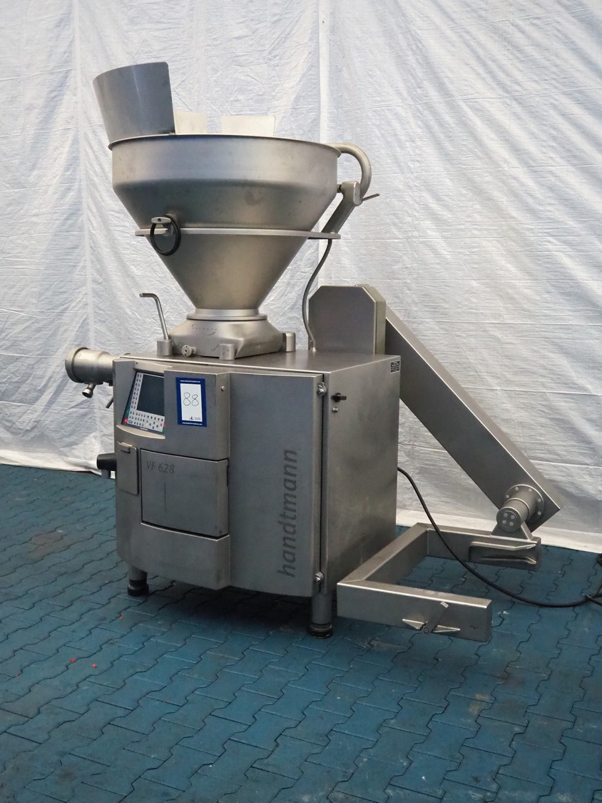 Handtmann vacuum filling machine with lifter for meat bins and grinding attachment, type: VF628, number: 24750, year of construction: 2008, 400 V, 3 Ph, 50 Hz, 26 A, 18 kW, Busch vacuum pump, type: KB 0040 D IZO, capacity: 40 m³ per hour, dimensions: 2200 mm x 1400 mm x 2300 mm. Grinding attachment incomplete.