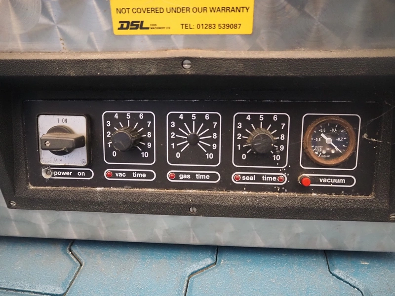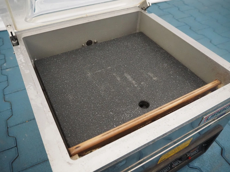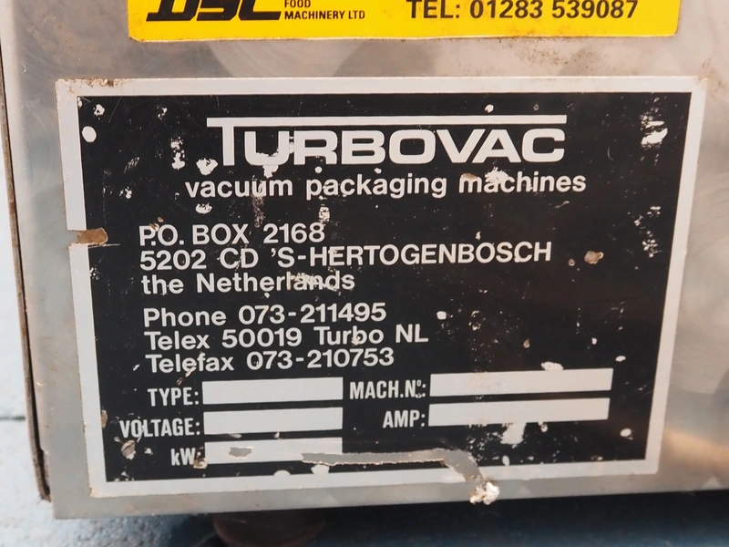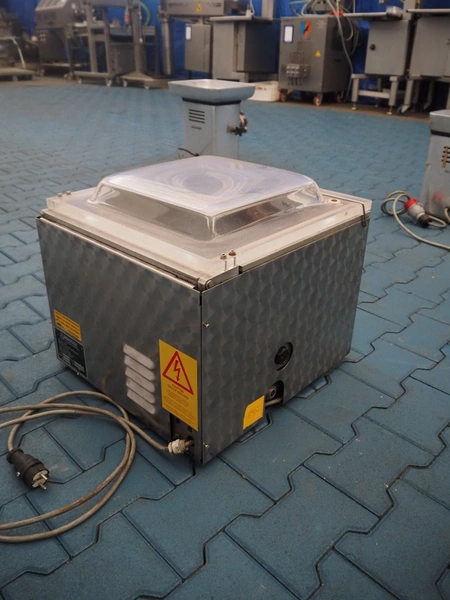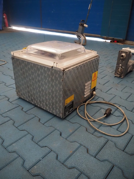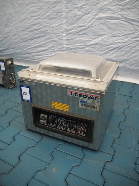 Turbovac vacuum machine, type: SB 15 H, number: 92144389, 220 V, 8.5 A, seal length: 400 mm, chamber: 420 mm x 420 mm, total dimensions: 500 mm x 500 mm x 450 mm.