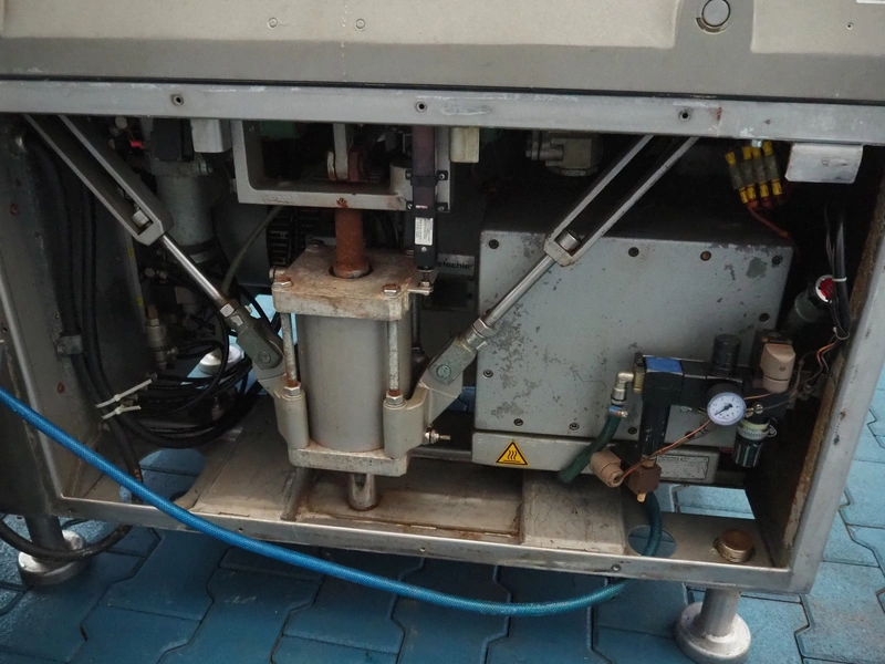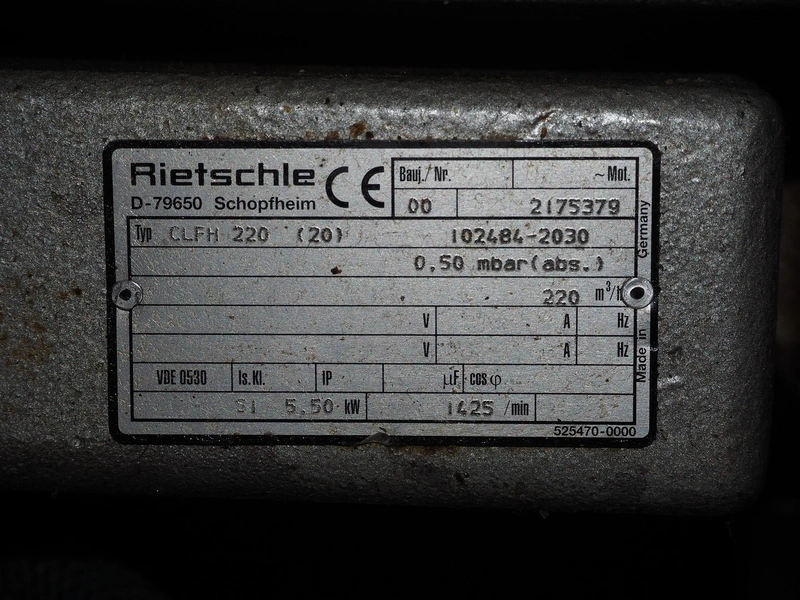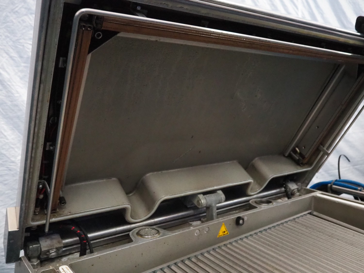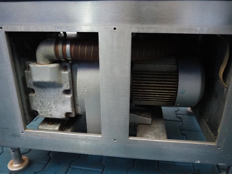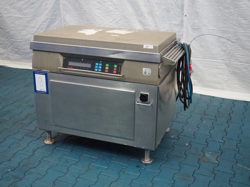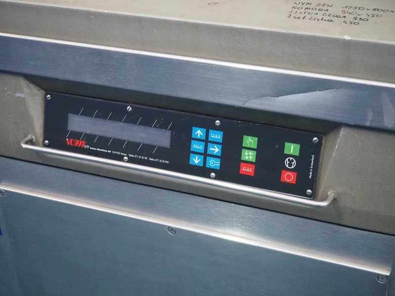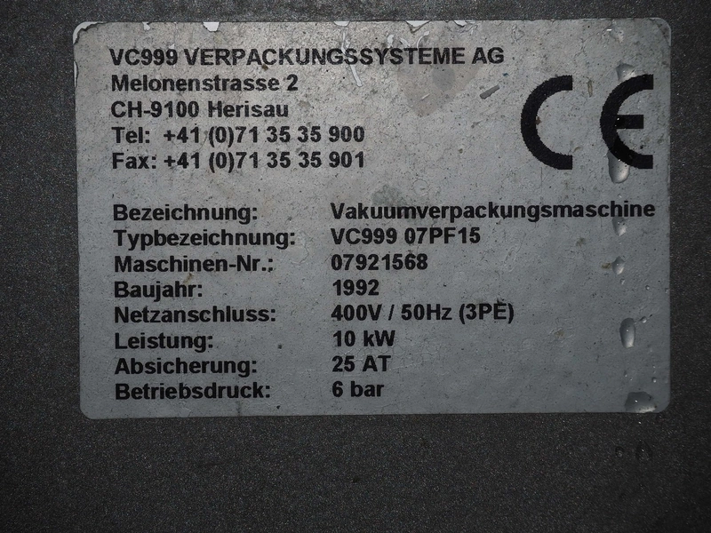 VC999 Verpackungssysteme AG vacuum machine, type: VC999 07PF15, machine number: 07921568, year of construction: 1992, 400 V, 3 Ph, 50 Hz, 25 A, 10 kW, Rietschle vacuum pump, type: CLFH 200 (20), year of construction: 2000, capacity: 200 m³ per hour, seal length: 950 mm and (2x) 450 mm, dimensions chamber: 950 mm x 450 mm, plastic outfeed rollers, roller width: 480 mm, total dimensions: 1250 mm x 750 mm x 1050 mm.