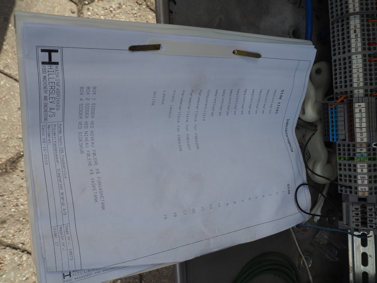 Maskinfabrikken Hillerslev a/s crate washer, plastic chain belt, belt width: 350 mm, clearance: 650 mm x 200 mm, total dimensions: 7300 mm x 1500 mm x 2000 mm.