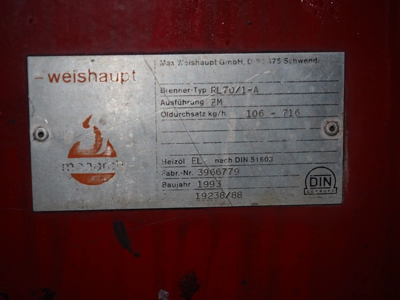 Weishaupt burner, type: RL70/1-A, fabrication number: 3966779, year of construction: 1993, dimensions: 2000 mm x 1600 mm x 1300 mm.