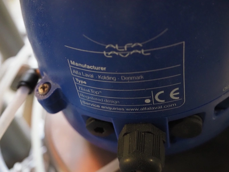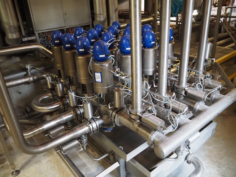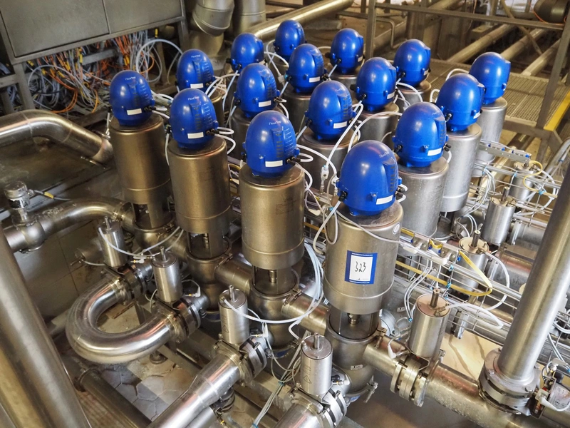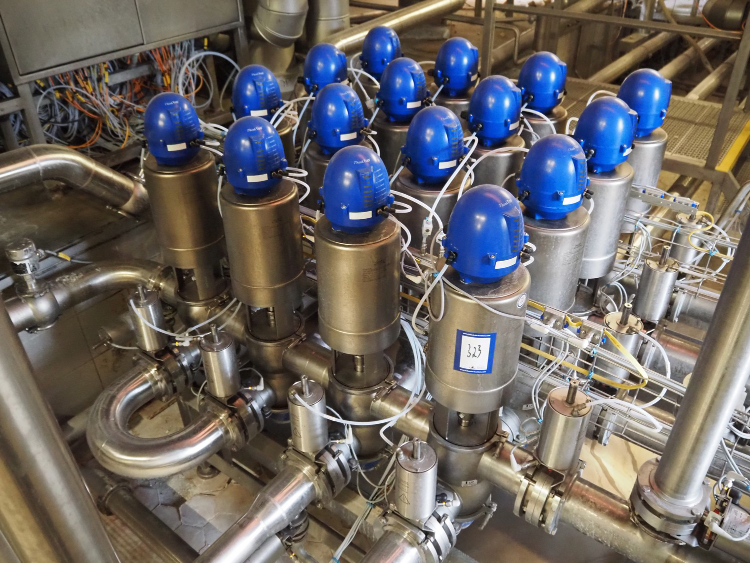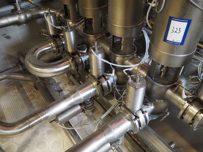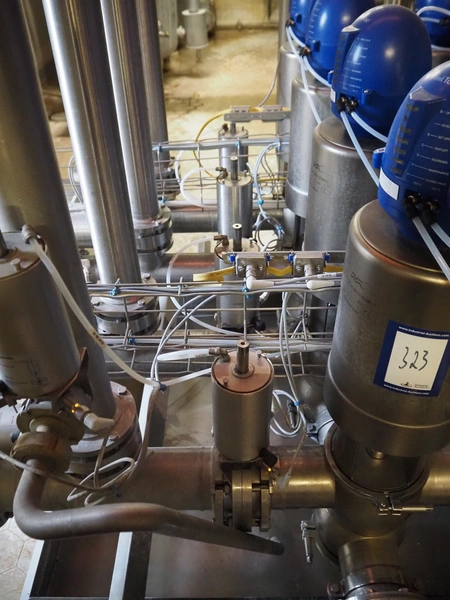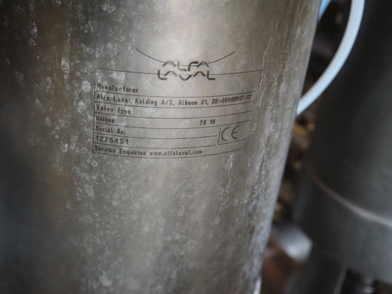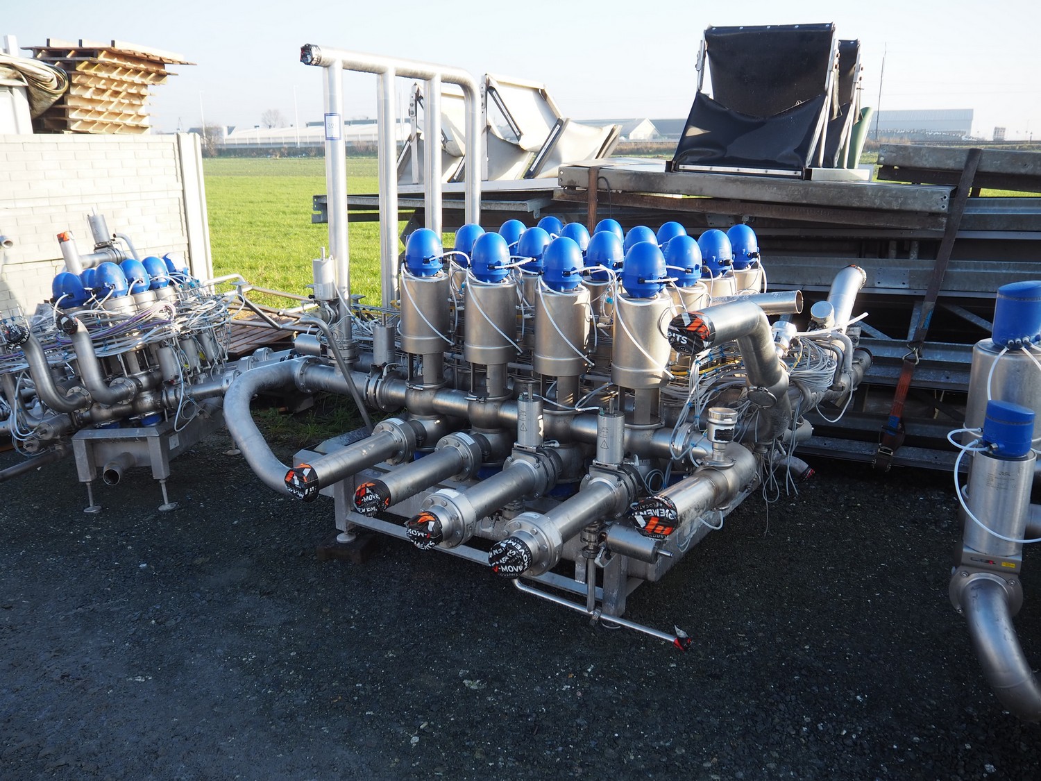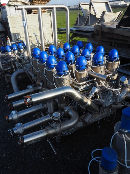 Manifold with 24 Alfa Laval valves and 16 regulators, dimensions: 1900 mm x 1300 mm x 1300 mm.