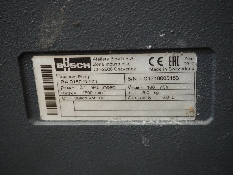 Busch vacuum pump, type: RA 0160 D 501, serial number: C1718000153, year of construction: 2017, capacity: 160 m³ per hour, dimensions: 860 mm x 600 mm x 500 mm.