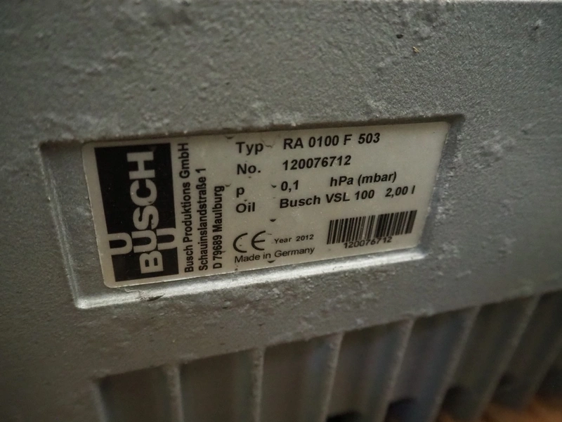 Busch vacuum pump, type: RA 0100 F 503, serial number: 120076712, year of construction: 2012, capacity: 100 m³ per hour, dimensions: 750 mm x 500 mm x 300 mm.