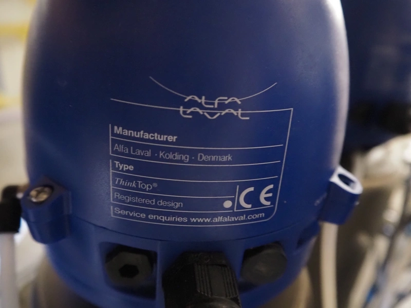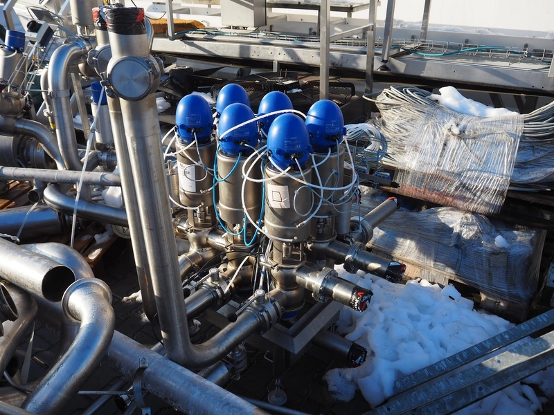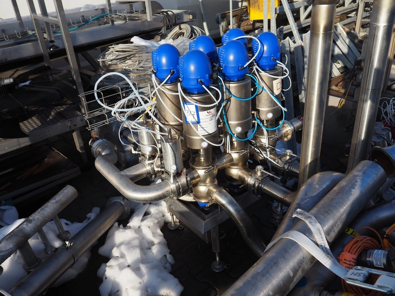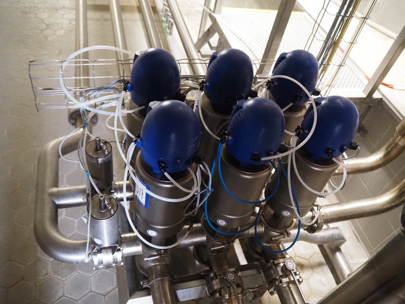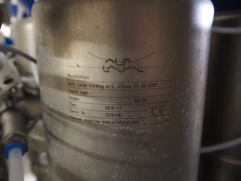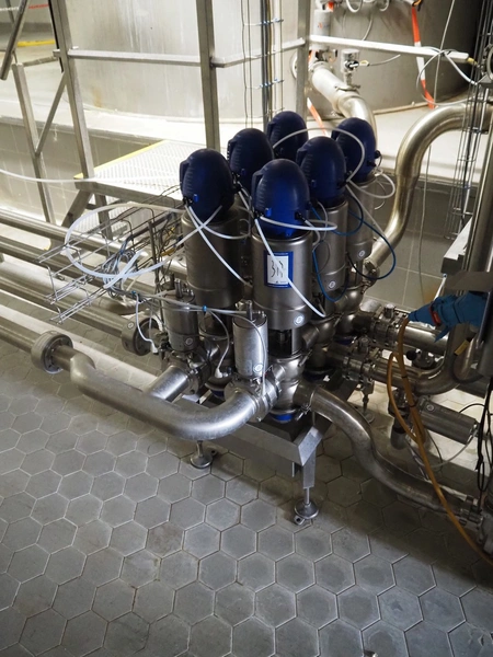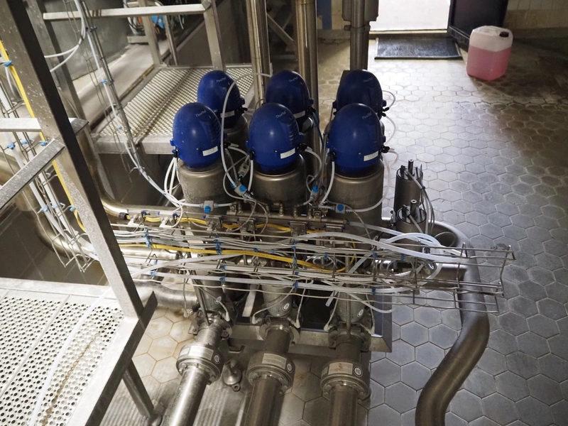 Manifold with 11 Alfa Laval valves and 6 regulators, dimensions: 800 mm x 550 mm x 1200 mm.
