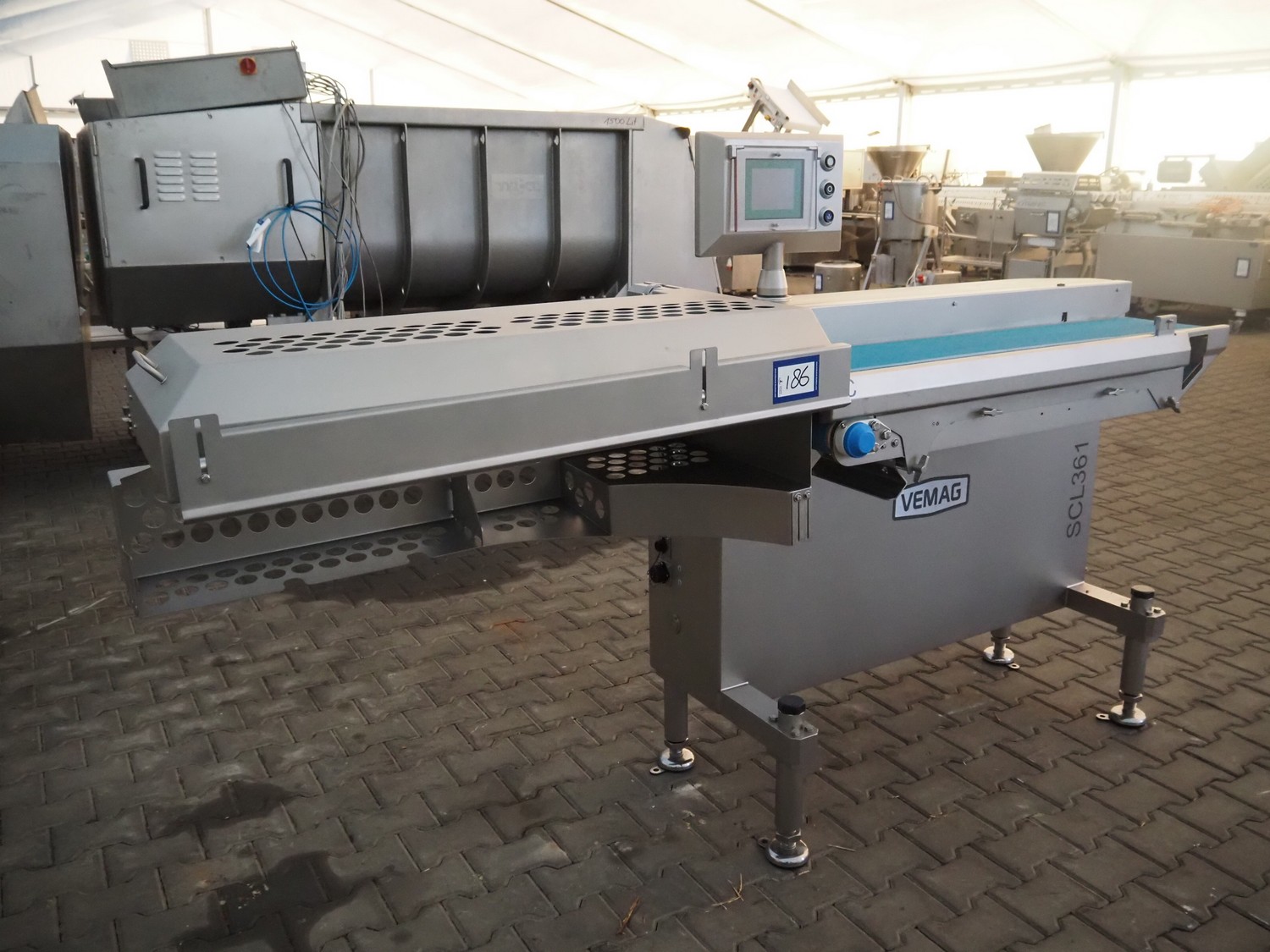 Vemag shuttle conveyor, model: SCL361, number: 3610087, year of construction: 2021, 400-460 V, 3 Ph, 50/60 Hz, 4 A, 3 kW, weight: 570 kg, plastic belt, belt width: 190 mm, total dimensions: 2440 mm x 750 mm x 1560 mm.