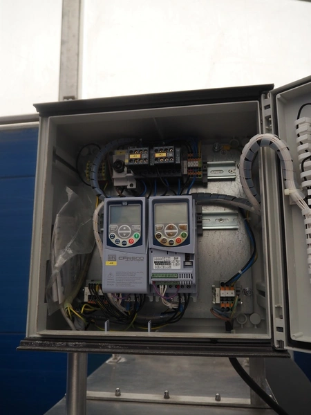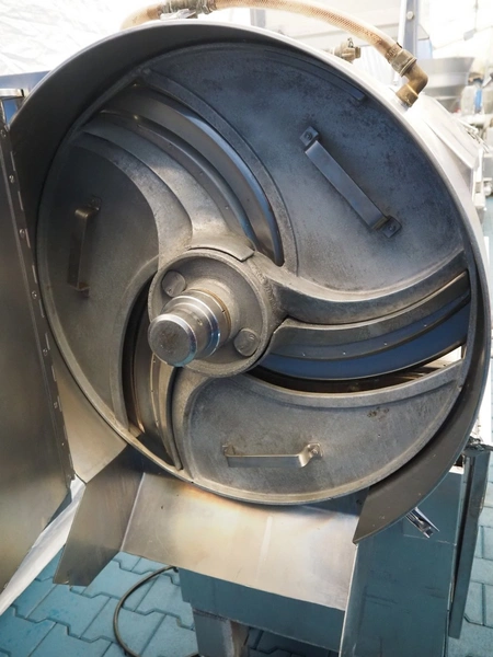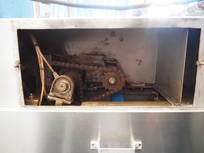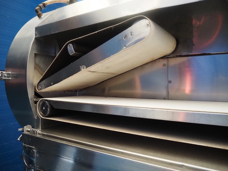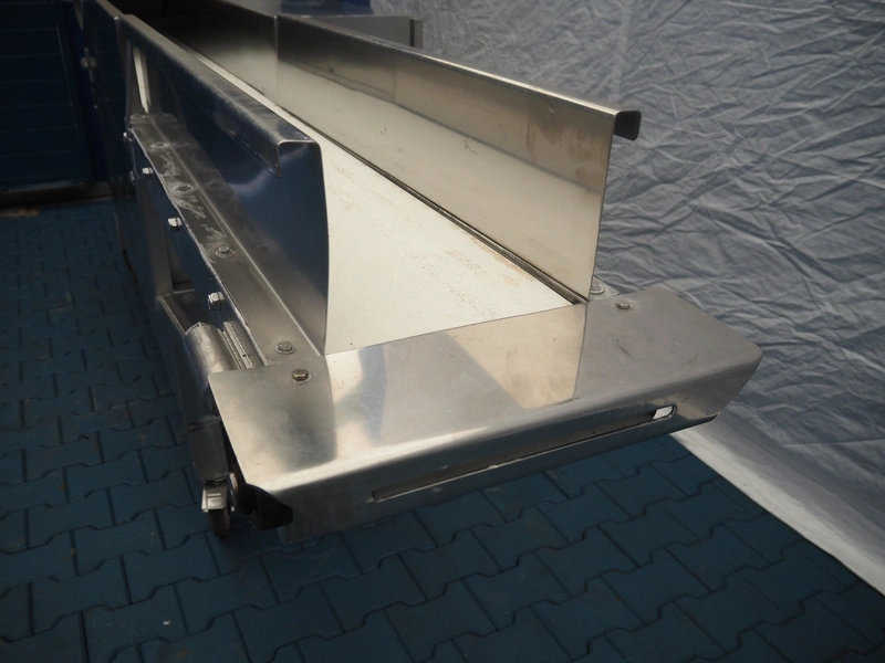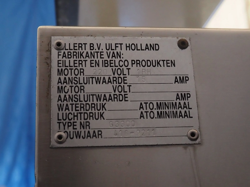 Eillert mobile vegetable slicer, type: G3300, serial number: 416-9211, 220 V, 1 Ph, plastic belt, belt width: 250 mm, clearance: 260 mm x 175 mm, total dimensions: 2300 mm x 850 mm x 2000 mm.