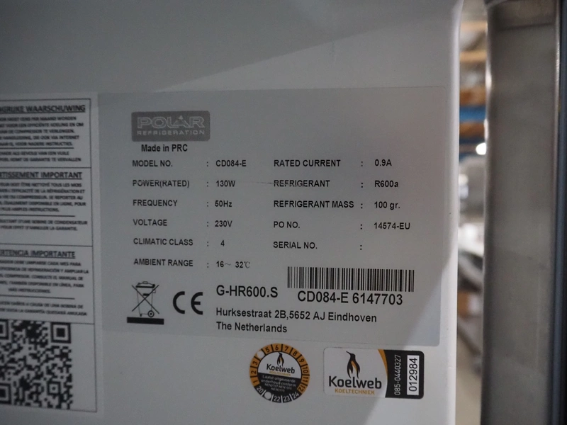 Polar refrigeration freezer, model: CD084-E, 230 V, 50 Hz, 0.9 A, 130 W, refrigerant: R600A/0.100 kg, 3 floors, floor dimensions: (3x) 640 mm x 500 mm, total dimensions: 770 mm x 700 mm x 1900 mm.