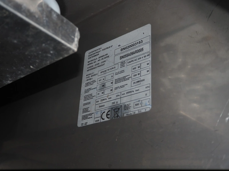 Catertech B.V. freezer, model: SPA BT 70 CON S, serial number: BN020003153, year of construction: 2009, 230 V, 1 Ph, 50 Hz, 4.2 A, 452 W, refrigerant: R404A/0.295 kg, capacity: 500 liter, 5 floors, floor dimensions: (5x) 530 mm x 650 mm, total dimensions: 700 mm x 800 mm x 2040 mm.