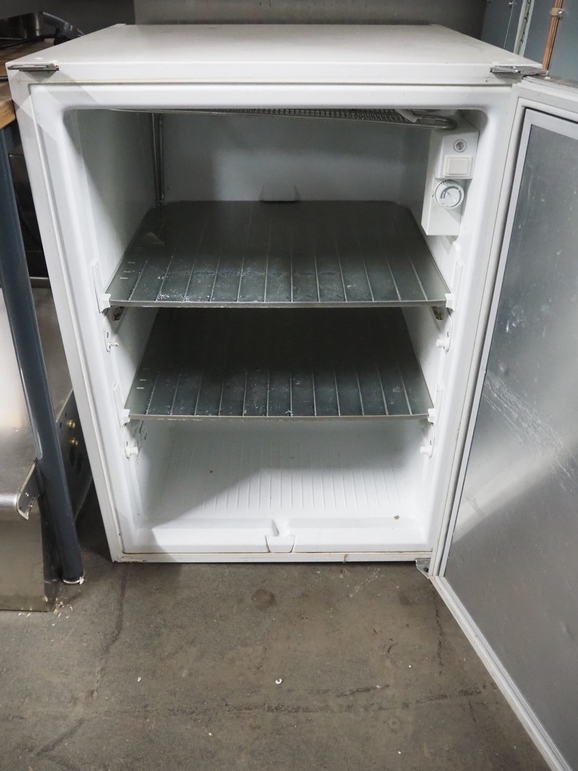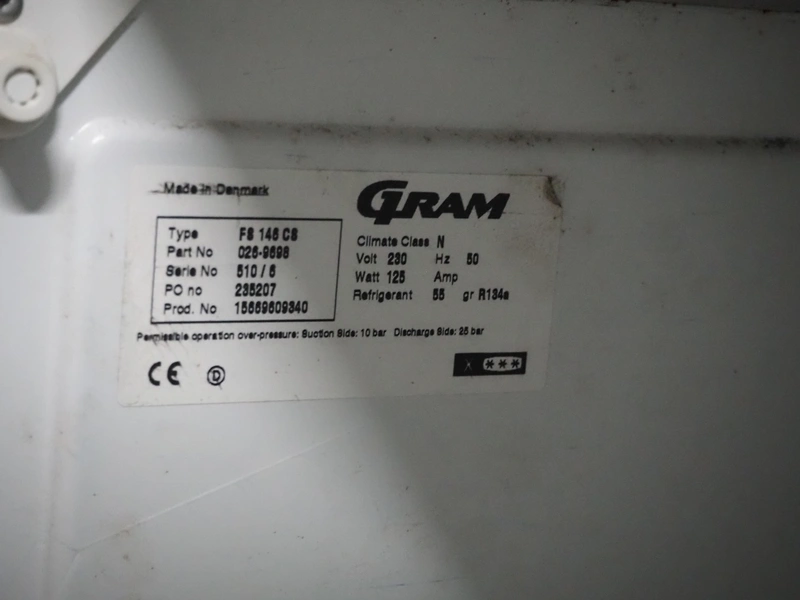 Gram freezer, type: FS 146 CS, serial number: 510/6, 230 V, 50 Hz, 125 W, refrigerant: R134a/0.055 kg, 2 floors, floor dimensions: (2x) 440 mm x 490 mm, total dimensions: 600 mm x 630 mm x 820 mm.