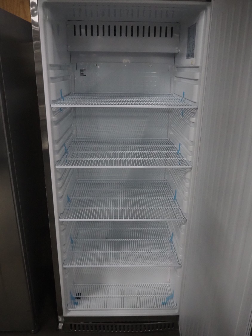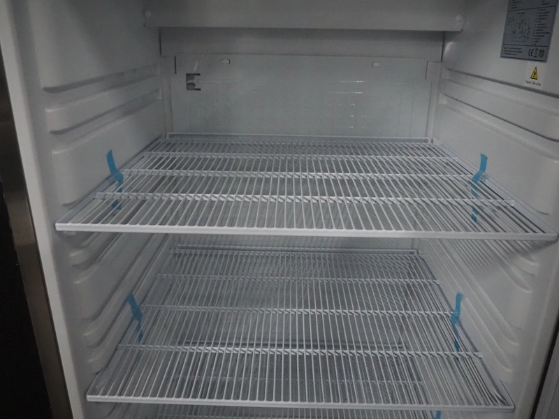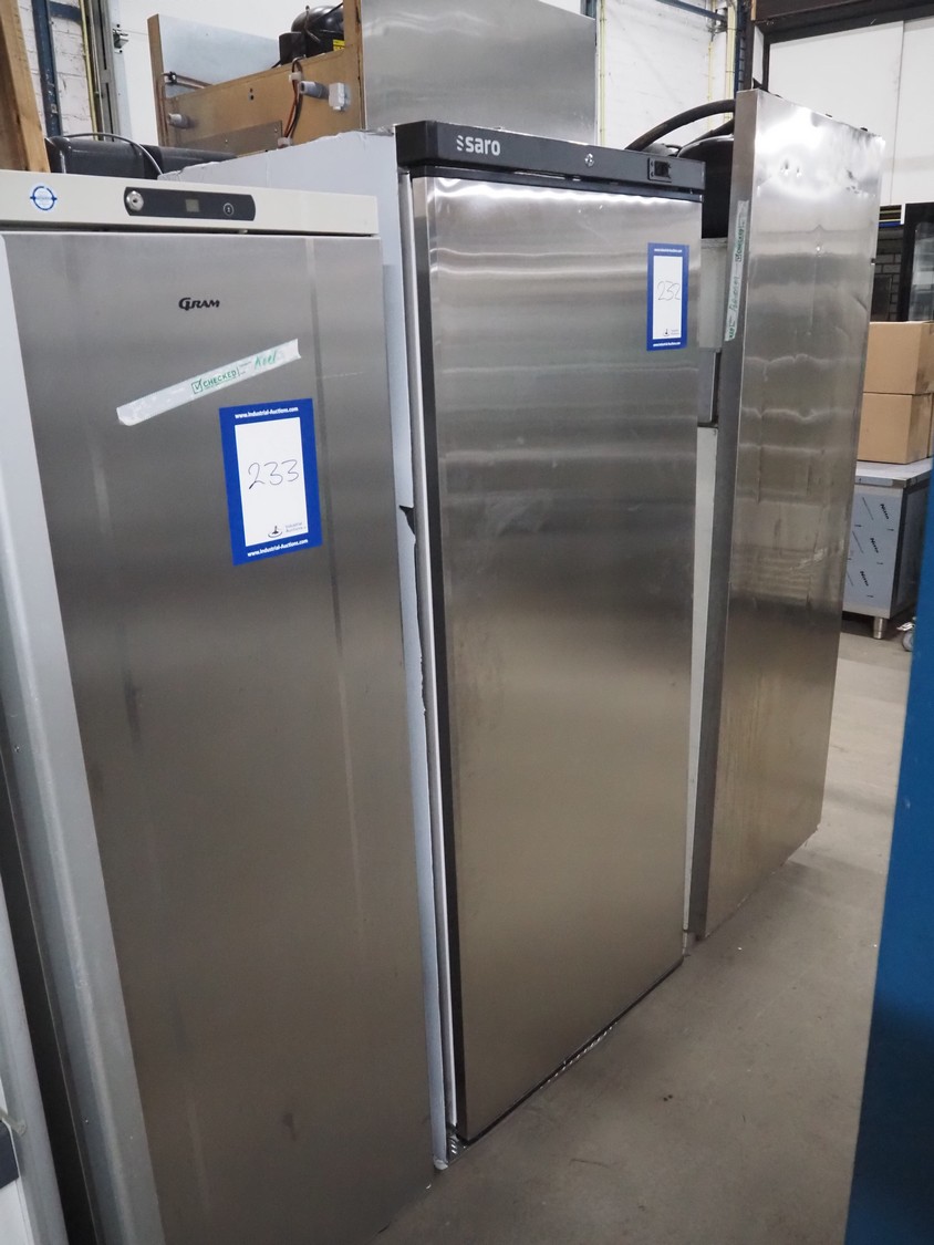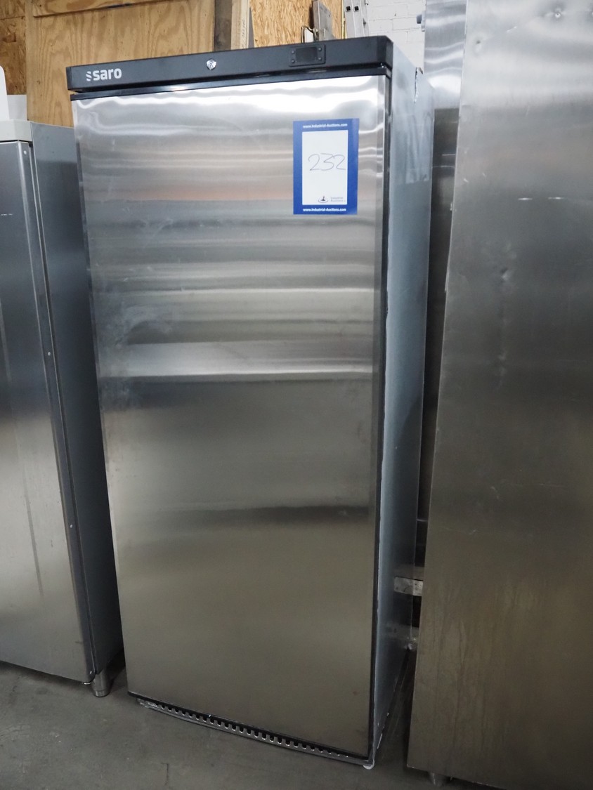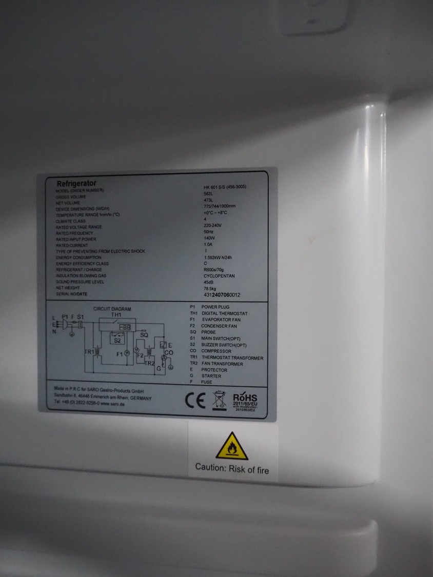 Saro Gastro-Products GmbH refrigerator, model: HK 601 S/S (456-3005), serial number: 4312407060012, 220-240 V, 50 Hz, 1 A, 140 W, refrigerant: R600A/0.070 kg, volume: 473 liter, weight: 78.5 kg, 5 floors, floor dimensions: (5x) 670 mm x 520 mm, total dimensions: 780 mm x 700 mm x 1910 mm.