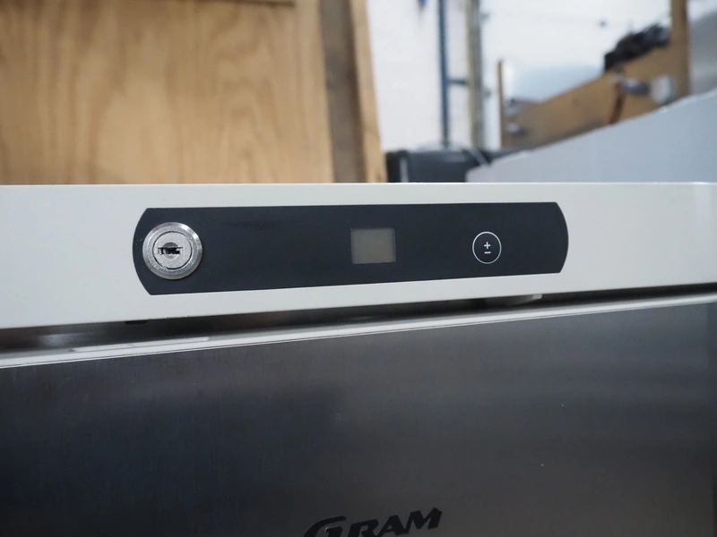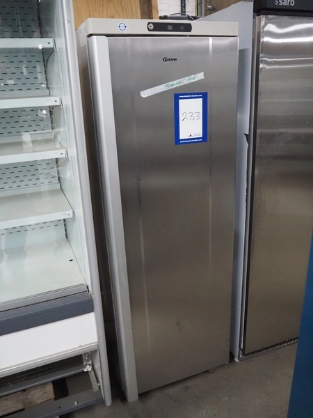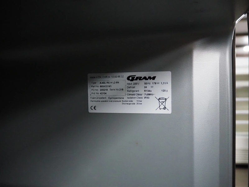 Gram refrigerator, type: K 400 RE H L2 6N, 230 V, 50 Hz, 1.11 A, 178 W, refrigerant: R134A/0.120 kg, 4 floors, floor dimensions: (4x) 530 mm x 440 mm, total dimensions: 590 mm x 620 mm x 1800 mm.