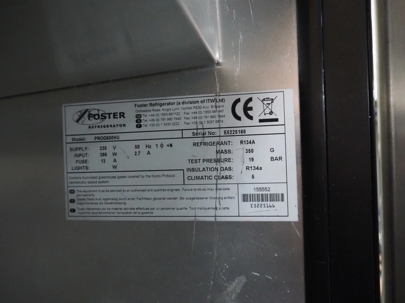 Foster refrigerator, model: PROG600HU, serial number: E5225166, 230 V, 50 Hz, 2.7 A, 386 W, refrigerant: R134A/0.350 kg, 2 floors, floor dimensions: (2x) 530 mm x 650 mm, total dimensions: 700 mm x 800 mm x 2040 mm.