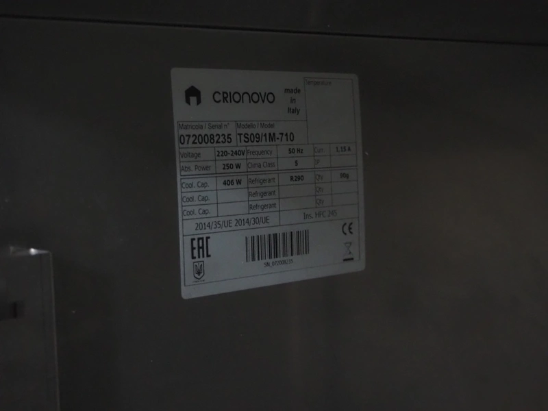 Crionovo refrigerator, model: TS09/1M-710, serial number: 072008235, year of construction: 2014, 220-240 V, 50 Hz, 1.15 A, 250 W, 7 floors, floor dimensions: (7x) 320 mm x 560 mm, total dimensions: 880 mm x 700 mm x 850 mm.