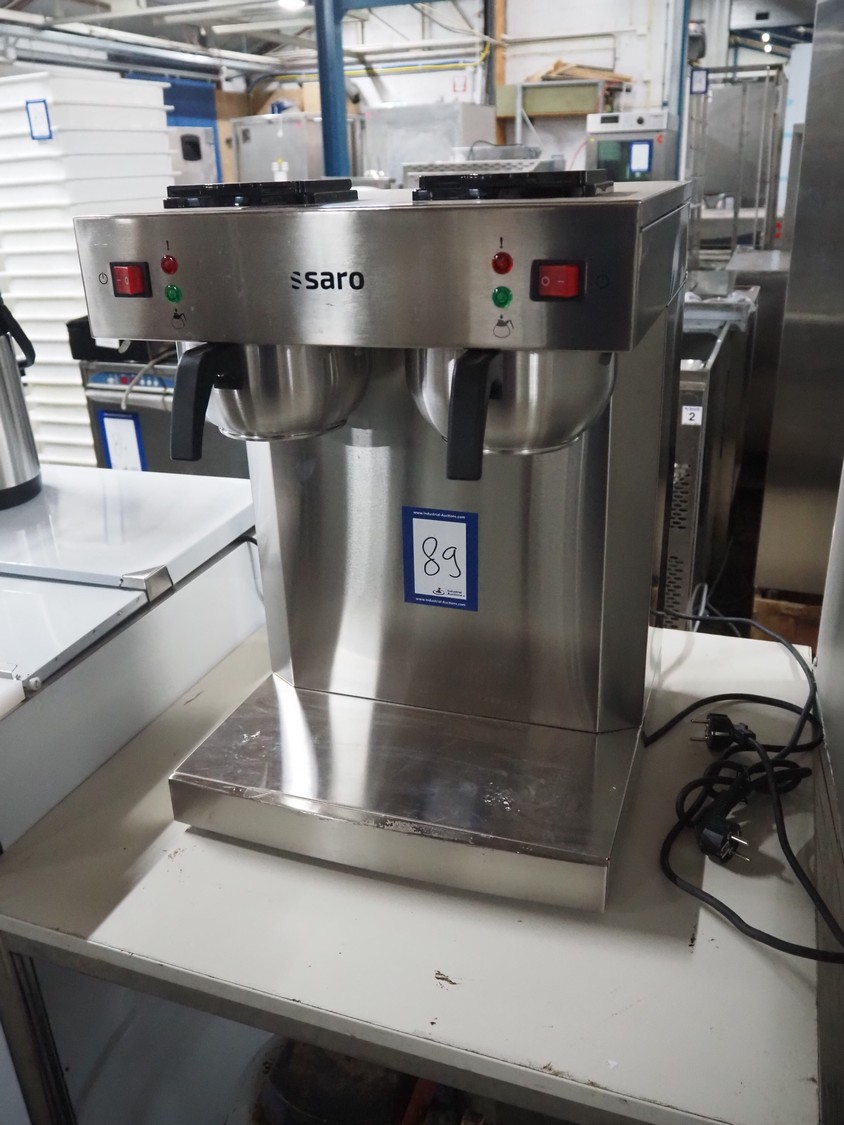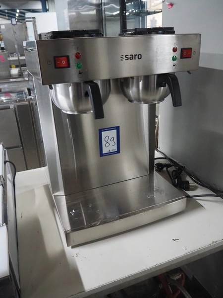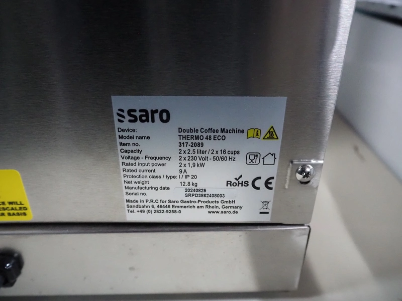 Saro Gastro-Products GmbH coffee machine, model: THERMO 48 ECO, serial number: SRPD3862408003, year of construction: 26.06.2024, 230 V, 50/60 Hz, 9 A, 1.9 kW, weight: 12.8 kg, capacity: (2x) 2.5 liter, dimensions: 500 mm x 400 mm x 550 mm.