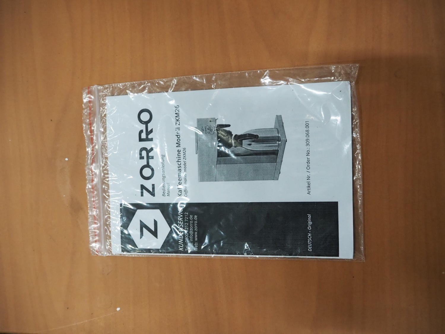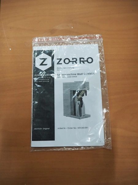 Zorro B.V. coffee machine, model: ZKM 26, serial number: SRV28624050067, year of construction: 20240525, 230 V, 50/60 Hz, 8 A, 1.9 kW, weight: 6.4 kg, capacity: 2 liter, dimensions: 390 mm x 210 mm x 550 mm.