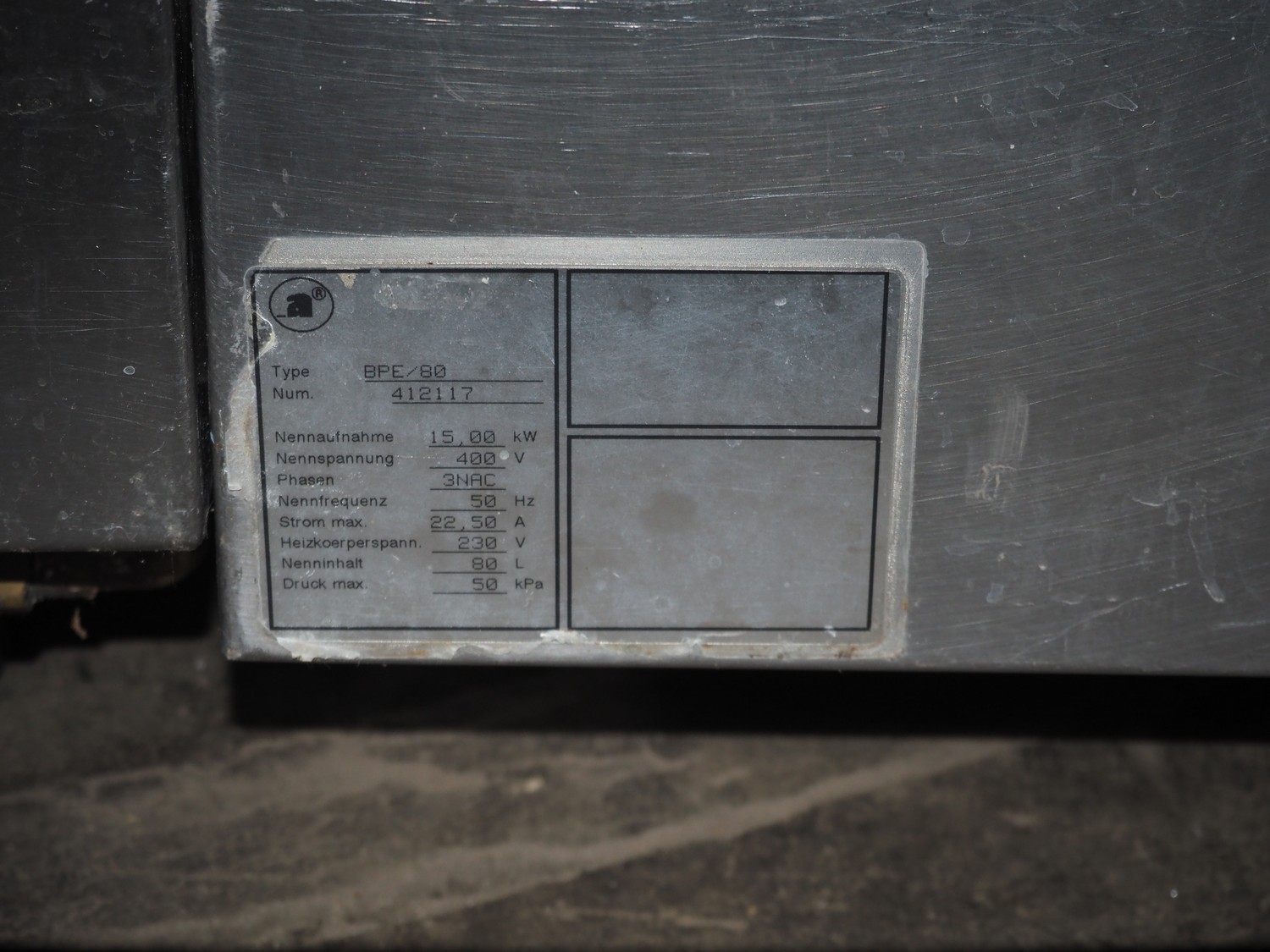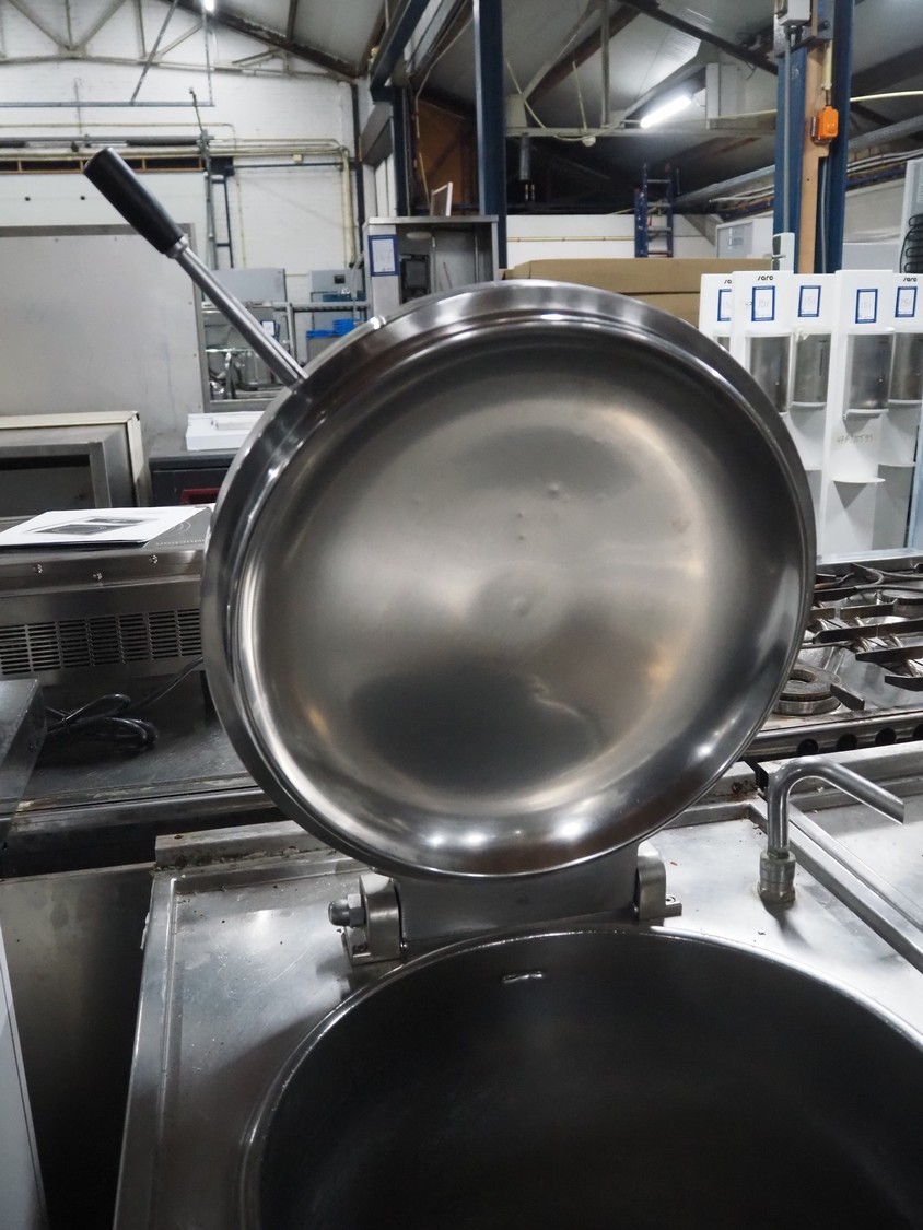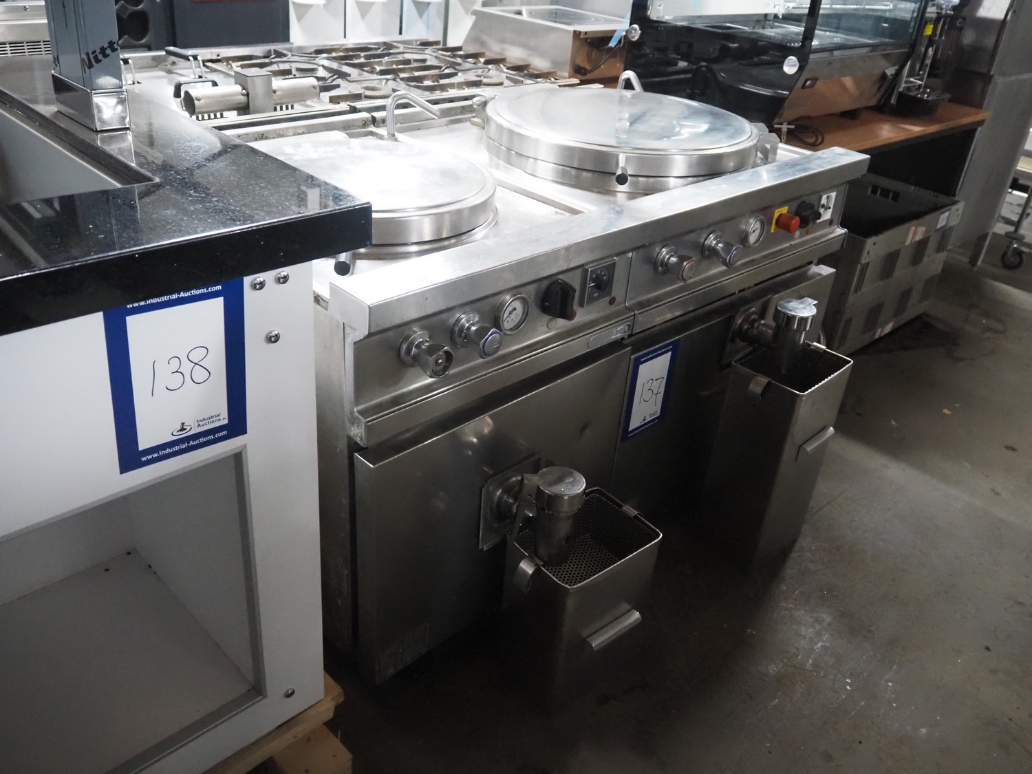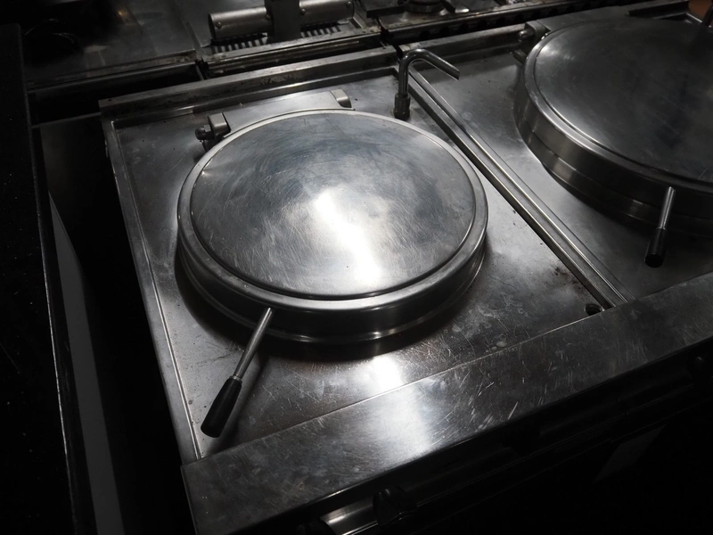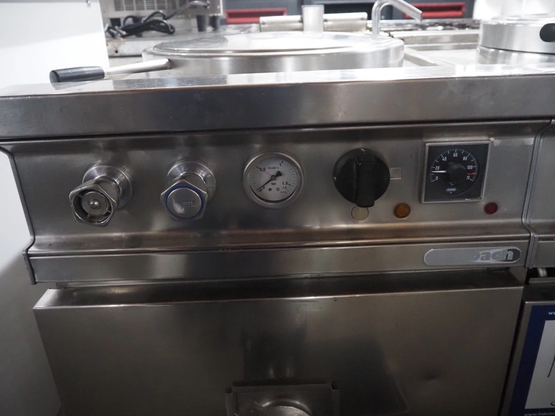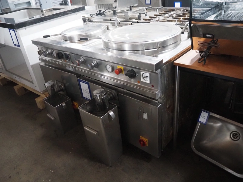Ambach double cooking vessel, type: BPE/80, numbers: 412116 and 412117, 400 V, 3 Ph, 50 Hz, 18.2 and 22.5 A, 12 and 15 kW, capacity: 60 and 80 liter, inside dimensions: Ø 600 mm x 300 mm and Ø 440 mm x 430 mm, total dimensions: 1500 mm x 960 mm x 860 mm.