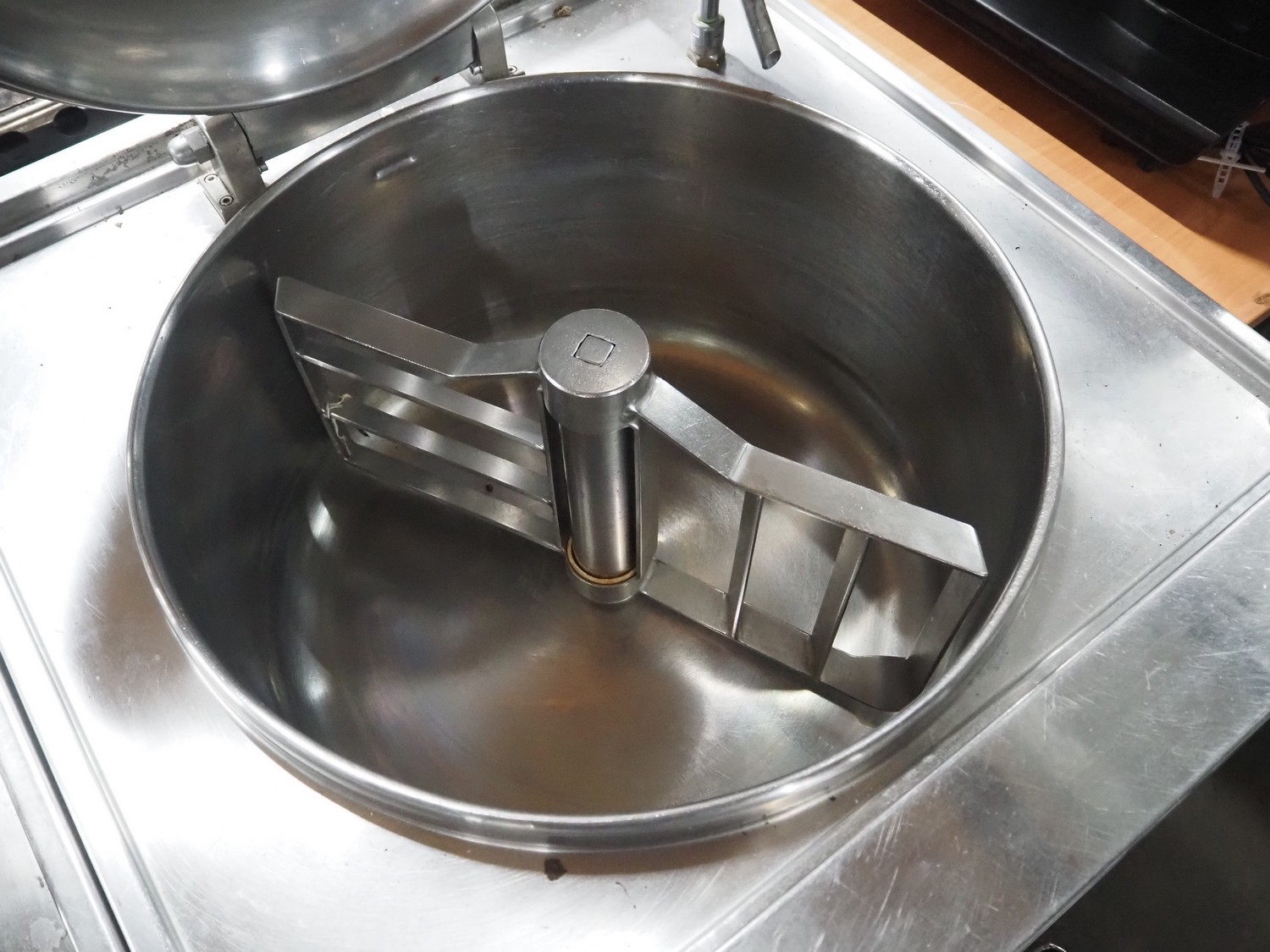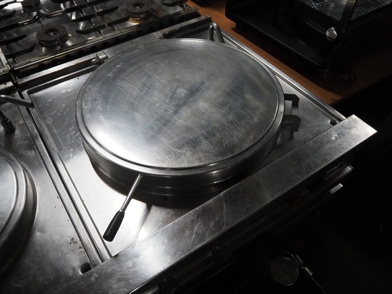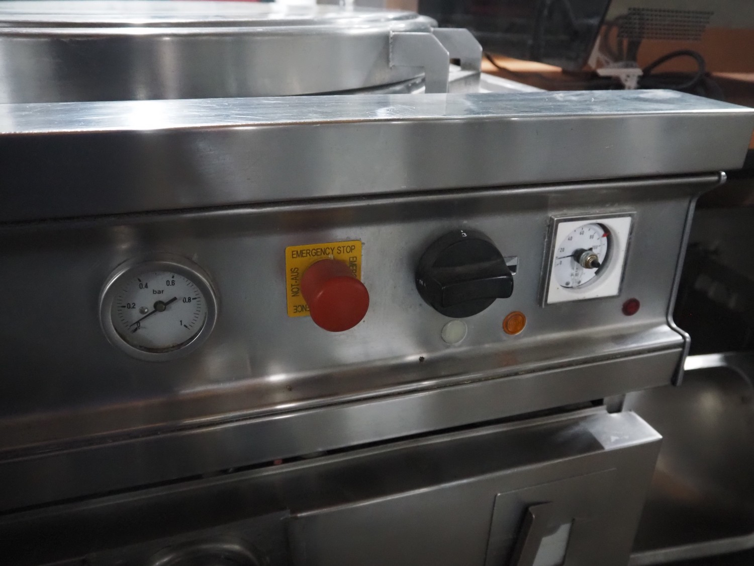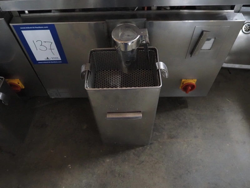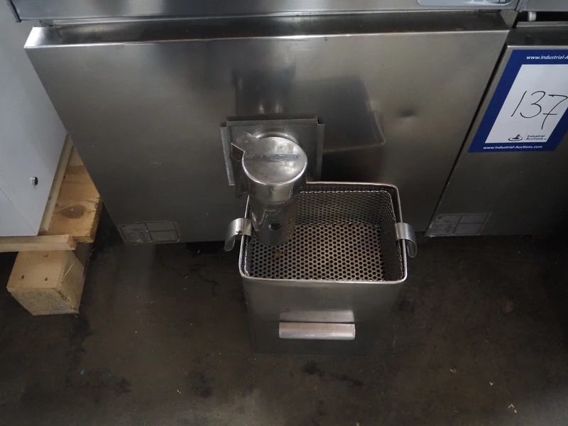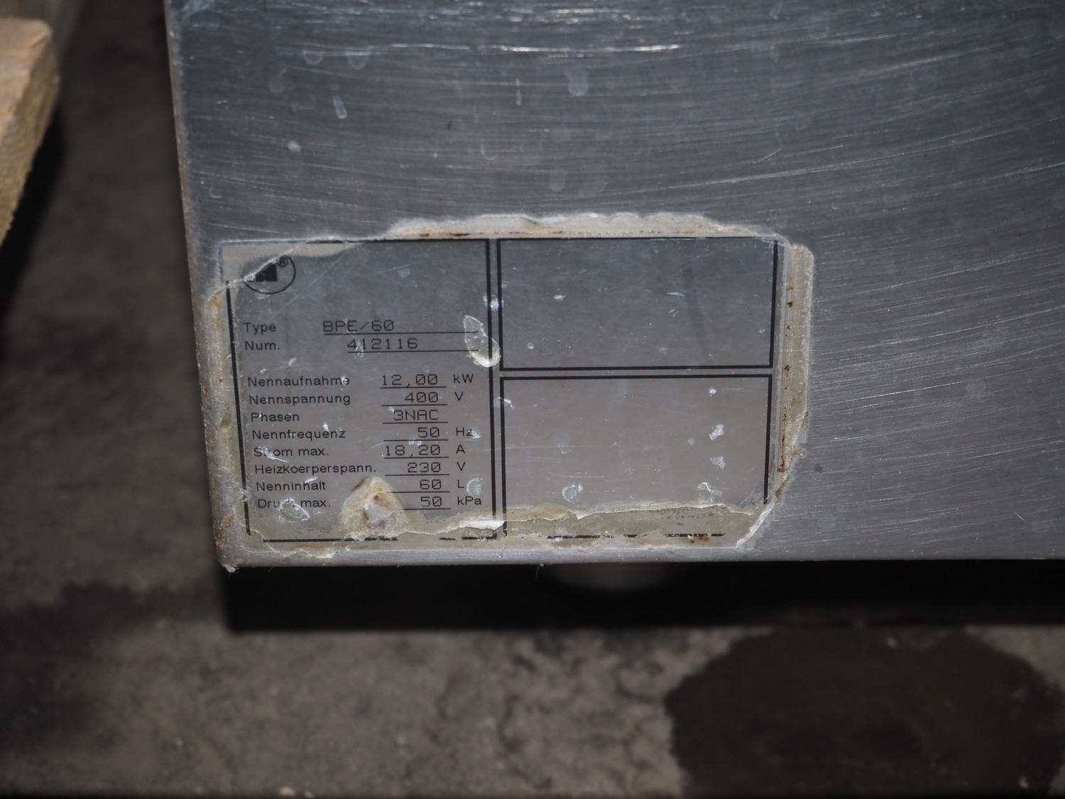 Ambach double cooking vessel, type: BPE/80, numbers: 412116 and 412117, 400 V, 3 Ph, 50 Hz, 18.2 and 22.5 A, 12 and 15 kW, capacity: 60 and 80 liter, inside dimensions: Ø 600 mm x 300 mm and Ø 440 mm x 430 mm, total dimensions: 1500 mm x 960 mm x 860 mm.